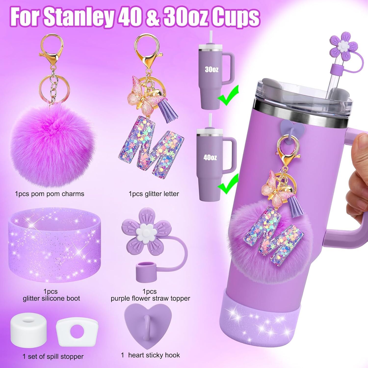 Purple Cup Accessories Set for Stanley Cup 40 30 Oz Tumbler with Handle, Cup Cha Personalize You Cups: The design of purple plush balls and flower themes is both elegant and interesting. The letter charms can be your initials, allowing you to easily identify the cup, avoid confusion, and highlight your personality and sense of exclusivity. Comprehensive Protection: The silicone cup boot can effectively protect the cup from scratches, collisions and other accidental damage, extend the service life of the cup. The spill stopper ensures that drinks will not leak easily, giving you more peace of mind during outdoor activities or daily use. You don’t have to worry about spilled drinks staining your clothes or backpack. Reliable Material:The straw cover, silicone cup boot and spill stopper are made of high-quality food-grade materials, protect your drinking water health. Let you feel more at ease during use and ensure the safety and hygiene of drinking water. Perfect Gift Choice: This set is practical and beautiful, making it a great gift for family, friends, colleagues, etc. Suitable for Valentienes Day, Mother's Day, Thanksgiving, Christmas and birthdays, or to thank others for their hard work, express your feelings. Package: You will get 1 flower straw cover topper, 1 letter charm keychain accessory customized and suitable for Stanley 40 30 oz handle tumblers, 1 set of spill stopper, 1 plush ball keychain, 1 silicone cup boot, and 1 heart shaped hook sticker. Must-have cup accessories for stanley cups! Shipping We offer FREE shipping on all orders! We ship within Three business days of payment, usually sooner. We use a selection of shipping services such as UPS, FedEx, USPS etc. We only ship to the lower 48 states, no APO/FPO addresses or PO Boxes allowed. Local pickups and combined shipping options are not provided at this time. Return You can return a product for up to 30 days from the date you purchased it. Any product you return must be in the same condition you received it and in the original packaging. Please keep the receipt. Customer satisfaction is very important to us. If you have any problem with your order, please contact us and we will do our best to make you satisfied. Contact Us If you have any queries, please contact us via ebay. We usually respond within 24 hours on weekdays. Please visit our eBay store to check out other items for sale! Thank you for shopping at our store.