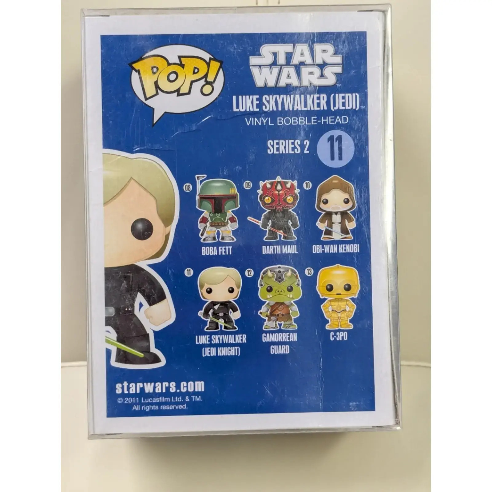 NEW Funko POP! Star Wars: Luke Skywalker Jedi (Damaged Box) #11 - Blue Large Font Vaulted Box. Luke Skywalker Grail/Rare Stored in a protector but there is some box damage on the back. 1 two inch crease in the bottom right of the back side and a crease across the top of the back side. Both shown in the pictures. This Funko Pop features Luke Skywalker in his Jedi attire, showcasing a vinyl bobblehead design. Part of Series 2, this collectible figure is numbered 11 and comes packaged in its original box. The character is depicted with his lightsaber, highlighting key details from the Star Wars franchise. Ideal for collectors, this item is a great addition to any Star Wars memorabilia. The box indicates it was manufactured by Funko in China.