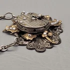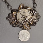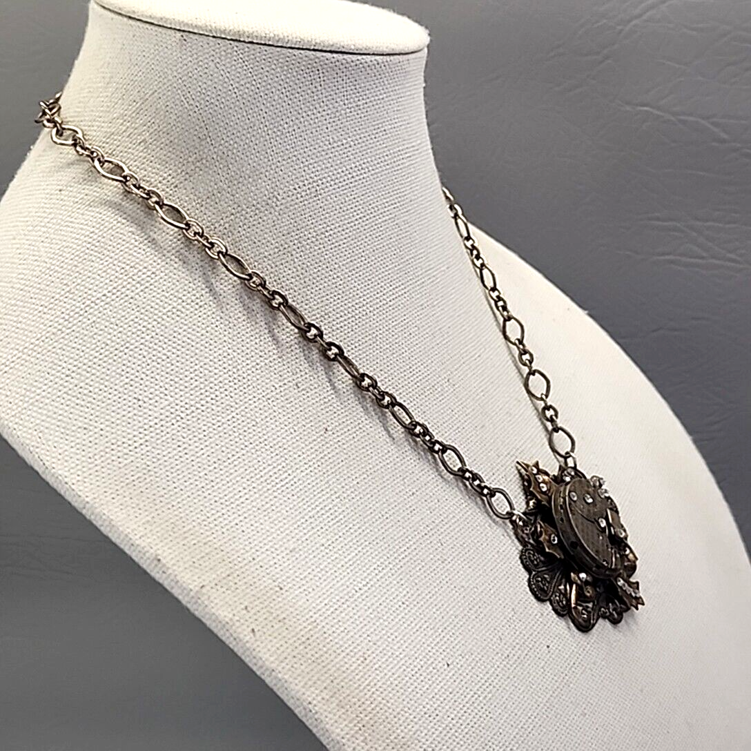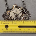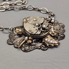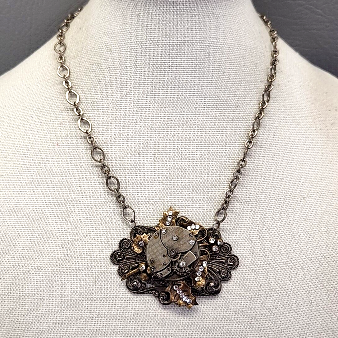 Steam Punk Necklace Lorraine Frances Watch Movement Artisan Craft 18" Artist: Lorraine Frances Color: Antique gold, clear Design: Steampunk pendant originated from various recycled pieces and accented with clear rhinestones and hung with a figaro chain link necklace. Stone: clear rhinestones Size: 18" L Materials: Mixed recycled media Magnetic: some of it is, some is not. Condition: Used but in good condition. See pics for details. BUY 2 JEWELRY ITEMS AND SAVE ON SHIPPING! Discounted combined shipping. Just pay for your jewelry items all in the same cart. Check back often as we list new items daily! PAYMENTS & CHECKOUT Payment is due immediately unless: it is an auction, or you are shopping the store for multiple items to receive a shipping discount. SHIPPING POLICY Fast Shipping (within 24 hours Mon - Fri) usually with shipping specified. Combined Shipping: Pay for your items in one cart and Ebay will automatically combined the shipping. In other words, pay for the multiple items in the same transaction. RETURNS Jewelry Returns: Free 30 day returns with seller paying for return shipping. Please return is exact condition it was received to receive a full refund. Other Items: 30 Day Returns offered excluding shipping. Buyer pays return shipping. The item must be returned in the original condition that it was sold to get a full refund, ie, if it had tags, the tags must still be on it; if it was sealed, it still needs to be sealed.