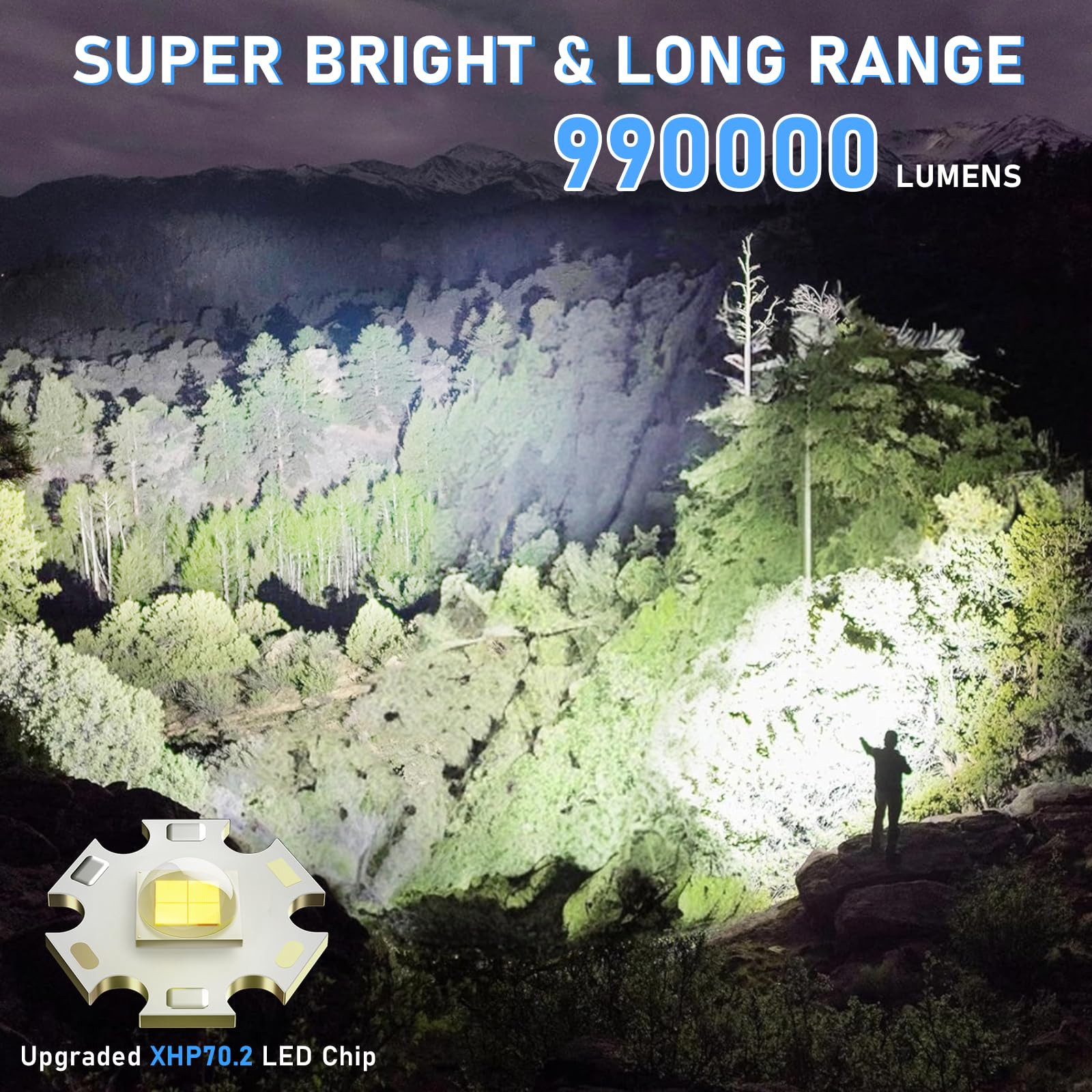 These flashlights are a game-changer! Super bright with 990K lumens—like daylight in your hand. The adjustable beam (spotlight to floodlight) and 7 lighting modes make it super versatile. Super long throw and rechargeable too—perfect for camping, emergencies, or nighttime tasks. Amazing value for a 2-pack!