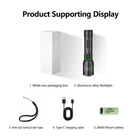 Super Bright LED Tactical Flashlight Rechargeable Work Light w/ Holster Features: 1, litre multi-function strong light torch, external 3000mAh 26650 lithium battery, long-lasting life, pressure-resistant aluminium alloy shell 2, white laser wick, high brightness beads, telescopic focus, adapt to a variety of environments, according to the lighting needs to adjust the distance between the near and far irradiation, to adapt to a variety of environments need to use the scene lighting needs, the use of handy 3、Three lighting modes, strong light long-distance lighting, low light close search, flash for help or warning 4, ype-C intelligent fast charging, charging fast and efficient and safe, support a variety of equipment charging, can be connected to the computer, car charger, USB socket and rechargeable treasure charging 5, daily life waterproof, IPX6 level sealing, wind and sand, rain, adapt to any harsh environment, give you plenty of courage in the adventure! Specification Wick: white laser Gear: strong/weak/burst flash Charging: Type-C charging Weight: 161.8g, 310g with case Size: 58X39X32mm Focus: telescopic focus Battery: external 18650/26650 Waterproof: Life-grade waterproof Long range: 500M+ Package Include: Product box Product torch Tactical Tail Strap Type-C charging cable 26650 Li-ion 18650 Features: 1, litre multi-function strong light torch, external 3000mAh 26650 lithium battery, long-lasting life, pressure-resistant aluminium alloy shell 2, white laser wick, high brightness beads, telescopic focus, adapt to a variety of environments, according to the lighting needs to adjust the distance between the near and far irradiation, to adapt to a variety of environments need to use the scene lighting needs, the use of handy 3、Three lighting modes, strong light long-distance lighting, low light close search, flash for help or warning 4, ype-C intelligent fast charging, charging fast and efficient and safe, support a variety of equipment charging, can be connected to the computer, car charger, USB socket and rechargeable treasure charging 5, daily life waterproof, IPX6 level sealing, wind and sand, rain, adapt to any harsh environment, give you plenty of courage in the adventure! Specification Wick: white laser Gear: strong/weak/burst flash Charging: Type-C charging Weight: 161.8g, 310g with case Size: 58X39X32mm Focus: telescopic focus Battery: external 18650/26650 Waterproof: Life-grade waterproof Long range: 500M+ Package Include: Product box Product torch Tactical Tail Strap Type-C charging cable 26650 Li-ion 18650