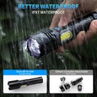 HIGH LUMENS & BRIGHTNESS:Super Bright Flashlight is made of the latest LED chip, which can output 900,000 high lumens.LED flashlight is 2 times brighter than normal incandescent bulbs, and lasts more than 120,000 hours. Suitable for home, camping, hiking, night running, mountaineering, and other outdoor activities. LONG LIFE TIME & QUICK CHARGE:Rechargeable flashlight with upgraded performance and up to 12 hours of illumination time. With USB fast charging mode, 2 times faster charging than traditional micro charging port, fully charged in 3-4 hours. Four blue indicator lights show the power level (25%, 50%, 75%, 100%). 7 LIGHTING MODES: 3 main lighting modes (high/medium/strobe) + 4 COB modes (high/medium/red/strobe). Quickly press the on/off button twice to switch to COB mode, and press and hold for 2 seconds to turn off any mode directly. Use as a work light or warning light in an emergency. ADJUSTABLE LIGHTING RANGE: This LED flashlight allows you to switch the light you need by retracting the head to suit different environments. Pull the head out for a spot light and retract the head for a flood light. WATERPROOF & ALUMINUM ALLOY MATERIAL: The flashlight is waterproof and can be used normally even in heavy rain outdoors. The shell is made of high-strength aluminum alloy material with a non-slip handle, exquisite and durable. PACKING LIST:You will get 2* Power Flashlight, 2* USB charging cable, 2* lanyard and 1* user manual.