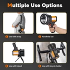 Items specifics: 1.Lighting Source: LED 2.Emitting Color: Yellow 3.Body Color: Gold 4.Head Diameter: 4.0IN 5.Body Length: 6.8IN 6.Side Light Mode: High/Low/SOS 7.Switch Mode: High/Flash/OFF(Long Press 3 seconds Flash/SOS mode on) Package Included: -1 x Handheld spotlight (battery included) -1 x 110v-120V Charger -1 x Shoulder strap -1 x Adjustable bracket -1 x Retail package Superbright Handheld Spotlight: The main light has 3 brightness modes: 1. High light/2. Low light/3.Long press 3 second switch to strobe light. The side light also has 3 brightness light modes: 1. High light/2. Low light/3.Long press 3 second switch to red and blue warning lights. Rechargeable& Intelligent: Built in 9600mA rechargeable battery with overcharge and over-discharge protection devices, thus, it’s very safety and reliable. if fully charge the battery, the charge time about 8 hours and the lighting time up to 10-20 hours. Power Bank Function: The rear the emergency spotlight has a USB interface. It can serve as a power bank for your smartphone or mobile devices in emergency, bringing you much convenience to your outdoor travel. Multiple Use Options: When you walk a dog, the shoulder strap can prevent the rechargeable spotlight falling. The adjustable bracket suit for camping, night fishing and barbecue, perfectly free your hands. Durable Material: The handheld spotlight shell made from military level ABS and aluminium alloy materials, it can prefect protect the spotlight from drops and bumps while in use.
