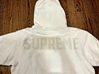 Elevate your streetwear game with this Supreme White Studded Logo Hooded Sweatshirt. Crafted from heavyweight cotton fleece, this sweatshirt features a drawstring closure and a crew neck. The long sleeve design and hood make it a perfect choice for winter, fall, and spring seasons. It comes in XL size with a regular fit, and is adorned with studded accents and the Supreme logo. This designer sweatshirt is ideal for gym and training, walking, and skateboarding. Get your hands on this solid patterned sweatshirt and add a touch of style to your wardrobe. Supreme is written across the back in gold studs, all of which are intact.