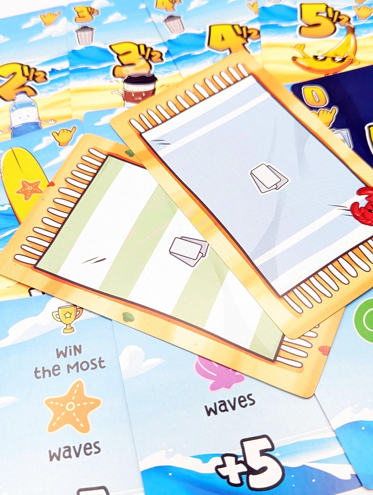 You and your rivals are surfers trying to gain the most points by catching the best collection of waves by the end of the game, dodging bluebottle stings, scoring bonus points from surfboards that match the waves you catch, and by satisfying each game’s 3 unique goals. 3 incoming waves are always visible to all surfers, who select and simultaneously reveal a 1 to 5 energy card they commit to catch the wave (worth 1 to 10 points) in the breakzone closest to the beach. The highest energy card revealed wins the wave, which is collected to be scored at the end of the game. However tied energy cards will cause surfers to wipe out, giving the next highest energy card surfer the win. 'Respect’ is the tiebreaker here, and a resource players can gain OR use to buy extra energy and surfboard (bonus point) cards from the beach when they win, or place second on each wave. The catch is that when you win and take a wave, the energy card you used is trashed (removed from the game), weakening your remaining energy, while the second place and other surfers discard their energy cards and may regain them later. So there is some advantage in coming second and strategically gaining more respect OR buying cards from the beach… Surfboards bought from the beach with respect add bonus victory points to some wave types, skewing the value of certain waves for some surfers as the game progresses. Temporary energy bought from the beach gives surfers an edge in later rounds. Bluebottle stingers sometimes blow into the breakzone, and players must avoid playing the lowest energy cards to escape their sting (0 to -3 points on the underside of each chosen bluebottle token). Or bravely take a sting to save a playable card for the next wave! Players running low on energy can rest (pass) to gain 1 respect, and regain their previously discarded energy cards. The ideal play is to commit just enough energy to win a wave as efficiently as possible at the right time. And then carefully choose when you take more respect (max 4), or when to the beach and what you buy. The game end is triggered when either: 1. All 5 bluebottles have been resolved, or 2. Any player only has their zero energy card left. The player with the most points between waves caught, matching surfboards, bluebottle stings and end game goals wins. Surfing Competition Theme: Players take on the role of surfers aiming to score the most points by strategically catching waves, avoiding bluebottle stings, and achieving unique goals throughout the game. Wave Catching Mechanism: Three incoming waves are visible to all players, and they simultaneously reveal a 1 to 5 energy card to catch a wave, with the highest energy card winning. Tied energy cards lead to wipeouts, with 'Respect' as the tiebreaker, a resource players can gain or use strategically. Resource Management: Winning a wave trashes the energy card used, weakening the surfer's remaining energy. Players in second place or lower can regain discarded energy cards and gain respect, which can be used to buy extra energy and surfboard cards from the beach. Surfboard and Energy Strategy: Players can purchase surfboards from the beach, adding bonus victory points to specific wave types. Temporary energy can also be bought, providing an advantage in later rounds. The strategic choice between coming first or second adds depth to gameplay. Bluebottle Sting Challenge: Bluebottle stingers can affect players with negative points. Players must balance playing high-energy cards to win waves with avoiding stings. Resting to gain respect and regain discarded energy cards adds a tactical layer.