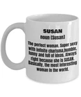 Susan First Name Adult Definition Funny White Porcelain Coffee Mug Cute Ceramic Product Details.. This high quality 11oz. ceramic white mug has a premium hard coat that provides crisp and vibrant color reproduction sure to last for years. Perfect for all hot & cold beverages. The highest quality printing possible is used. It will never fade no matter how many times you wash it. Material: 100% Ceramic. Print both sides. Dishwasher and Microwave Safe. High Gloss + Premium White Finish. Printed in the U.S.A. Personalized & Custom. We support personalized and custom mug to add custom, when placing an order, you can add notes to the "order note" in shipping address section. Also you can contact us directly via message. Shipping Info. Ready to ship in 1 to 2 business days, All products are made-to-order and proudly printed in the United States. Shipped by USPS and DHL, You will receive your order in 5-7 days. Replace & Refund. All products are defective during shipping broken, chipped will be replaced free of charge. You are not satisfied with the product, we will refund 100% money to you. If any other issues arise, please do not hesitate to message, we would be more than happy to assist you.