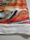 I bought several packages of fabric that were sealed. I've taken out of packaging to measure width and take pictures. This one is an abstract multi color tiger stripe stretch knit measuring 64" wide. I'm selling this now by the yard. More than one yard will be cut in a continuous length. Check out my other listings for similar fabrics. Returns accepted within 30 days in same condition as purchased. Buyer pays return shipping. Shipping USPS Priority Mail.