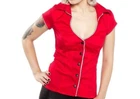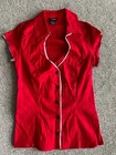 Switchblase Stiletto pretty blouse, size MEDIUM. It is red with black and white trim and black snap buttons down the front . It has only been worn once and is in great shape. The fabric is 97% cotton, 3% spandex and has stretch. Measurements for this top lying flat: Bust: 16 inches or 40 cm Waist: 14 inches or 35.5 cm Length, collar to hem: 24 inches or 70 cm Please carefully compare your measurements to the ones listed, as I do not take returns . Thank you so much for looking!
