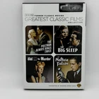 TCM Greatest Classic Films: Murder Mysteries DVD | Big Sleep Maltese Falcon VGC THE MALTESE FALCON (1941) NOT RATED Some high-living lowlifes want to get their hands on a bejeweled falcon. Detective Sam Spade (Humphrey Bogart) wants to find out why - and who'll take the fall for his partner's murder. Sydney Greenstreet, Mary Astor, Peter Lorre and Elisha Cook Jr. costar in a crackling film of Dashiel Hammett's novel, adapted and directed by John Huston. THE BIG SLEEP (1946) NOT RATED L.A. private eye Philip Marlowe (Humphrey Bogart) takes on a blackmail case... and wears out his gumshoes trailing murderers, nightclub rogues, the spoiled rich and more. Lauren Bacall joins Bogart under Howard Hawks' brisk and atmospheric direction of an ace adaptation of Raymond Chandler's novel. DIAL M FOR MURDER (1954) Alfred Hitchcock's screen version of Frederick Knott's stage hit casts Grace Kelly, Ray Milland and Robert Cummings as points of a romantic triangle. She loves Cummings; her husband Milland plots her murder. But when he dials a Mayfair exchange to set the plot in motion, his right number gets the wrong answer! THE POSTMAN ALWAYS RINGS TWICE (1946) NOT RATED Based on the novel by James M. Cain (Double Indemnity, Mildred Pierce), this quintessential film noir stars John Garfield and Lana Turner as illicit lovers who botch a first attempt to bump off her husband, pull it off and betray each other at trial. Amorous attractions never proved so fatal as in this steamy classic. ---------------- Smoke-free home. Items stored in cool, dry space. Please see photos for best description of the item’s condition. All photos are of the actual item listed for sale. We do our best to provide proper photos and descriptions of the items to insure there are no surprises once received. We will ship your item within 1-2 business days of purchase. Thank you for shopping Declutteringo!