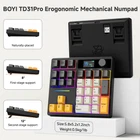 Multi-function 30-key Numeric keypad: TD31Pro numpad with NumLock/ESC/Delete/Copy/Paste/Pgup/Pgdn and a shortcut key which can open the computer calculator directly.This number keypad is very easy to use Tri-mode Connection Number Pad: Work with Bluetooth 5.0, 2.4GHz,Type-C wired connection,Can connect up to 3 devices at the same time.This rechargeable numpad is equipped with a 1000mAh large-capacity battery which has long-lasting battery life Big Features on a Multimedia TFT Display Screen: Is there anything this TD31Pro mechanical number pad can display? Custom DIY gif image,numlock,connection mode,WIN/MAC system,battery status,RGB Mode,etc. Enjoy the fun of Custom your own unique keypad Mode Switching&Enhanced Metal Knob: Default Volume Mode's Knob Can One Click to Mute! Press the FN+knob to quickly switch volume/screen modes.The knob of the screen mode Can easy control the Screen display content but not Support one Click to Mute Hot-Swappable Wireless Number Pad: With full POM Jadeite Green HIFI Linear Lubed Switches,meaning that the force at the beginning and the end of each stroke is nearly identical. Hot-swap PCB allows you to replace 3 pins/5 pins Mechanical switches freely without soldering issue South-facing LEDs Gasket Mounted Structure: 16.8 million RGB presets are nice and varied! Features a gasket-mounted design ensures ultra-comfortable typing with reduced sound and shock. RGB music rhythm lighting effects are supported by the software driver Pro Software Customizable Numpad: Fully Programmable Keys,You can remap your numpad by your willing. There are two different angles you can choose from to meet your longtime typing/gaming needs with this Ergonomic numpad Dye Sublimation PBT Keycaps Number Pad: Features PBT sublimated themed keycaps. Wear-resistant and long-lasting,it also has anti-oil and anti-gloss properties.PBT keycaps offering a special texture makes it easier to type Widely Compatible Number keypad: This mechanical number pad widely compatible with your computer or laptop and other keyboards without numeric section. Compatible with almost all operating systems with Windows Mac,OS,Android