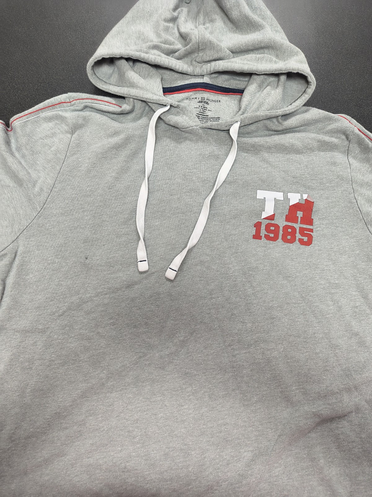 This pre-owned Tommy Hilfiger Hoodie in size L features long sleeves and a pullover style. The gray hoodie is made of a blend of polyester and cotton, with a fabric type of cotton, suitable for machine washing. It has a regular fit and is designed for men's casual wear, perfect for activities like walking. The hoodie does not have vintage characteristics and is crafted in the United States by the renowned brand Tommy Hilfiger.