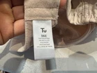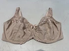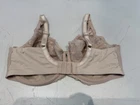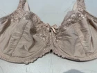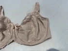 This beige TU bra is a size 36E balconette style bra with floral lace detailing and embroidered accents. It features underwiring for support and a full coverage design. The bra has bra strap closures with hook & eye fastenings for a secure fit. Made of opaque lace fabric, this bra is perfect for women looking for both style and comfort in their lingerie collection.