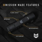 PLASMA LIGHTER: Electric lighter with dual arc functions despite harsh winds and heavy rain, ten-second automatic shut off FLASHLIGHT: Powerful, high beam intensity of 100 lumens with 3 flashlight modes: high, low and strobe FEATURES: Lighter/Flashlight 2-in-1 is waterproof, windproof, button-activated, includes locking mechanism, built-in short circuit protection, with compact size of 3.8 inches long and 1 inch wide, weighing in at only 2.3 ounces; material composed of zinc, aluminum and polypropylene RECHARGEABLE: Includes USB charging cable so torch can be conveniently recharged multiple times USES: Tactical Torch is an essential tool for your outdoor backpack or pocket and perfect for lighting candles, starting a campfire, outdoor use, EDC, camping, and a great gift for the tactical enthusiast