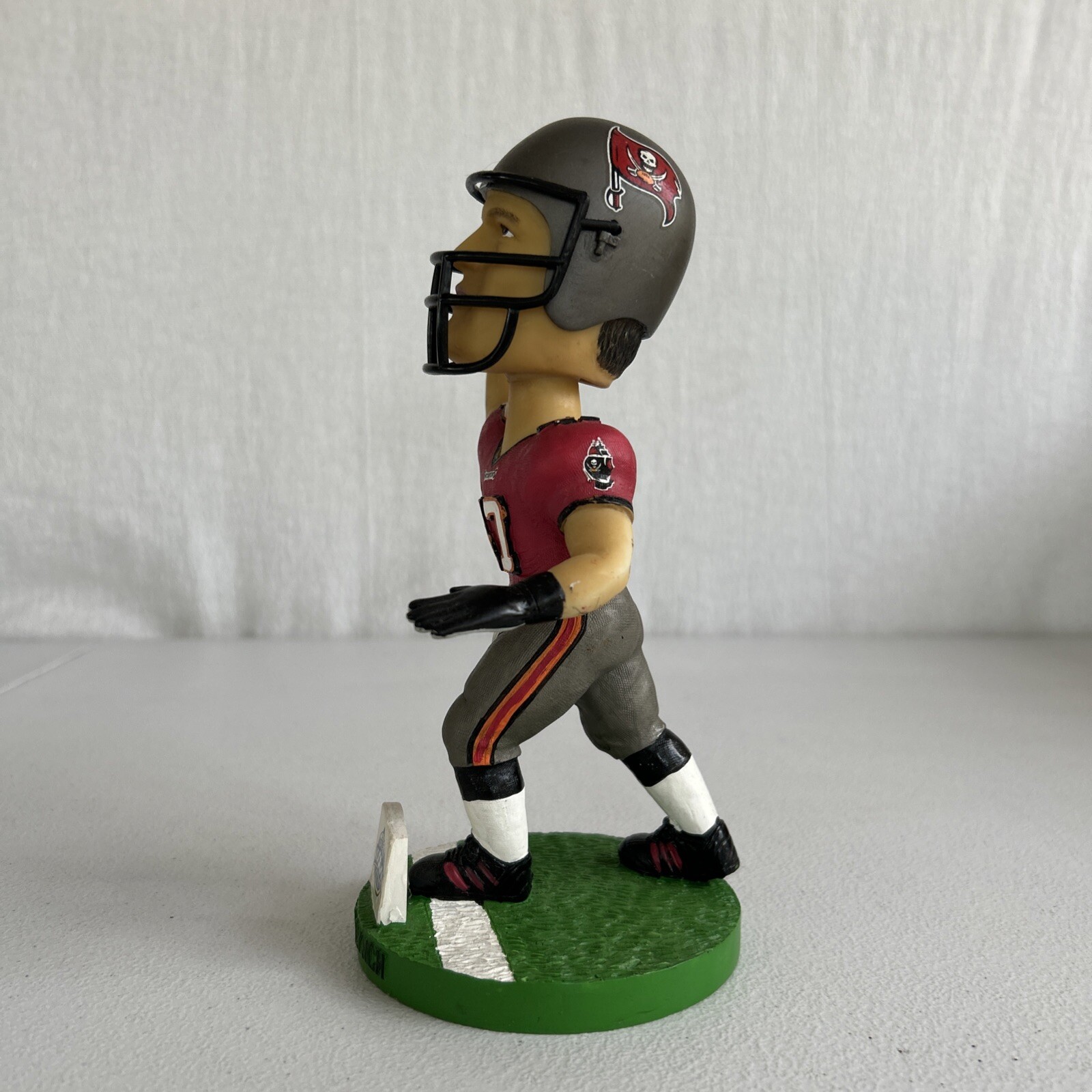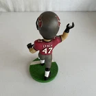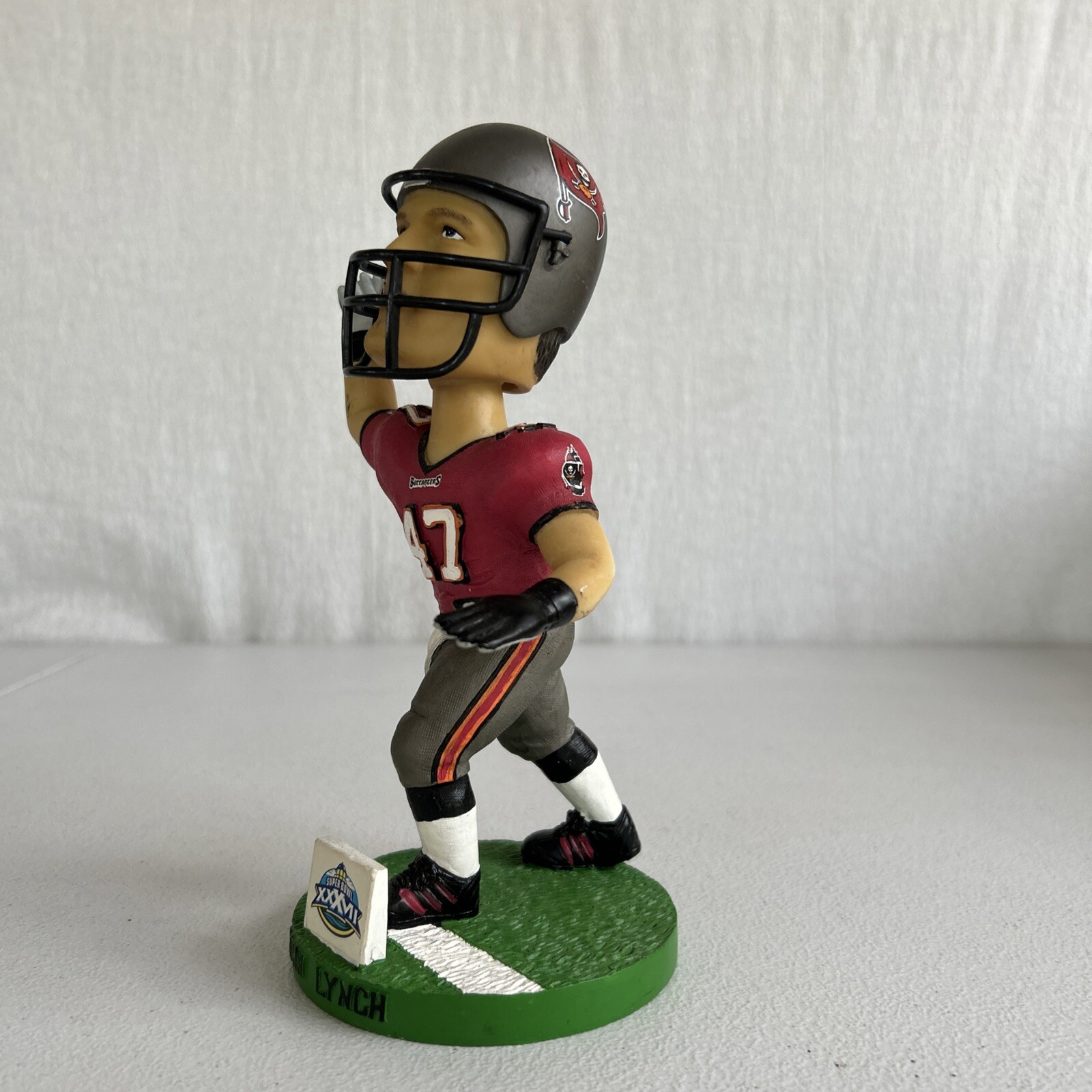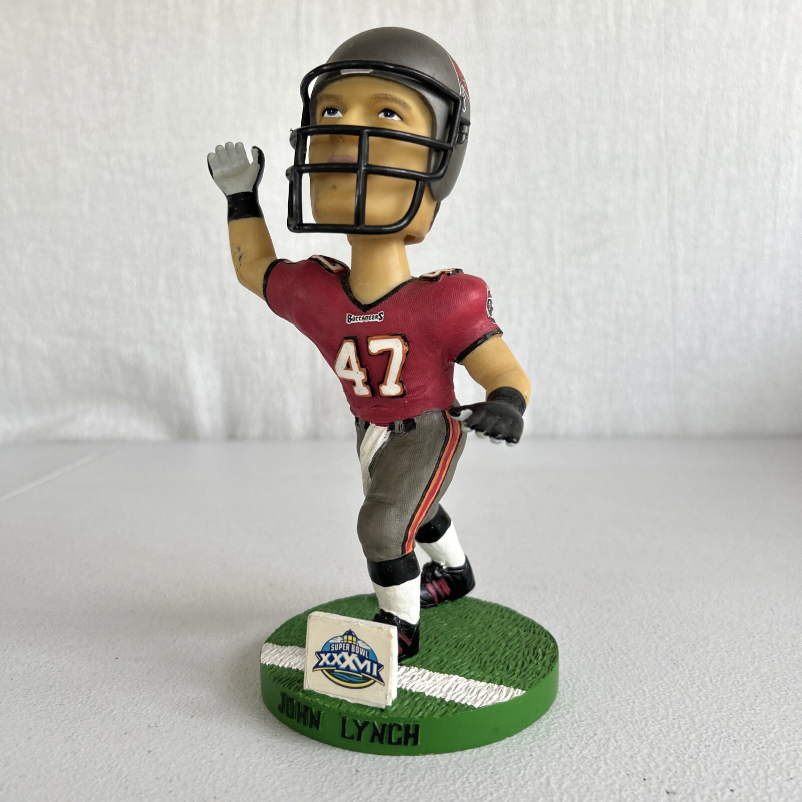 The product is a Bobble Dobbles Bobblehead featuring John Lynch, a former NFL player for the Tampa Bay Buccaneers. This collectible item is part of the NFL Super Bowl XXXVII collection and is limited to 4000 pieces, with this specific one being numbered 421. The bobblehead has a height of 5.5 inches and a width of 3.5 inches, and it was manufactured in China.