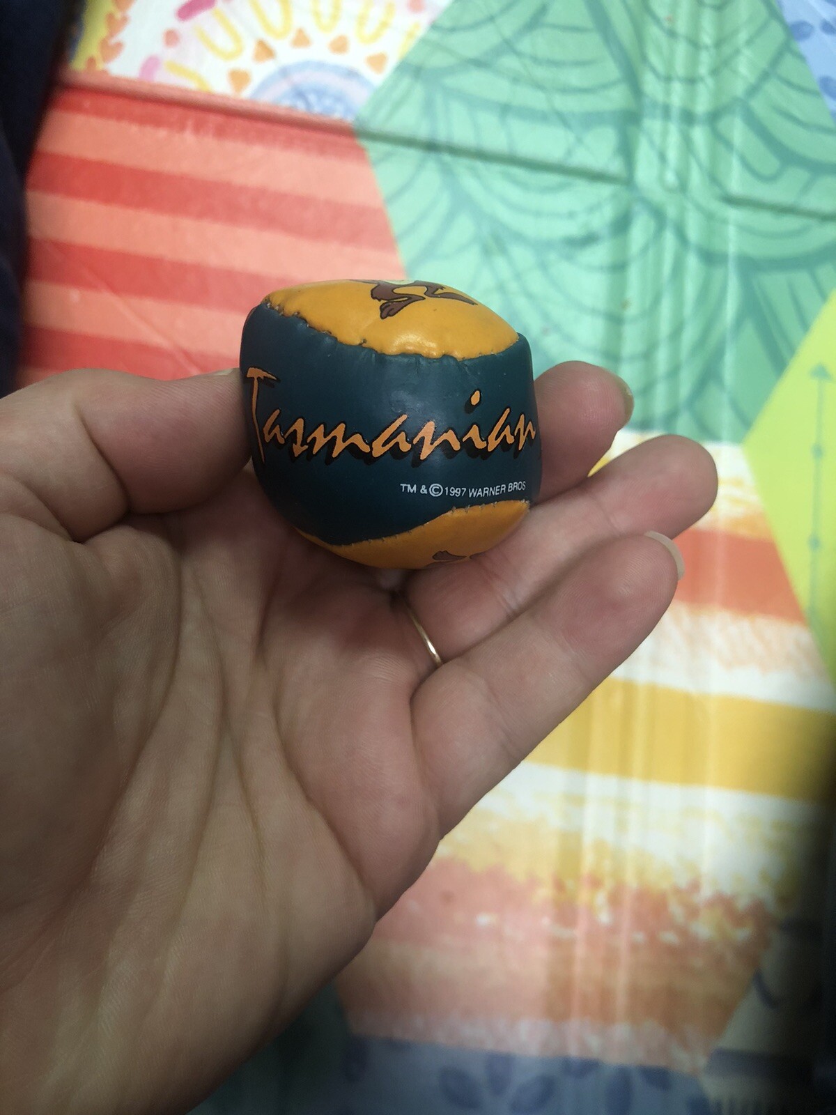 This collectible keychain features the beloved Looney Tunes character Taz the Tasmanian Devil. Made from pleather and manufactured in China in 1997, this keyring is in the shape of a beanbag ball and showcases Taz's vibrant design. Perfect for any fan of the animated series, this keychain is a must-have addition to any collection of animation merchandise.
