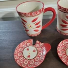 The Temptations 14 oz. Mug & Coaster/Lid Set features a charming Old World design in Cranberry color. Made of ceramic & porcelain, each coffee mug is hand-painted and includes a coaster and lid. Perfect for hot or cold beverages, this set mugs is ideal for all occasions. Coaster is good for teabag or spoon. Can be set on top to keep beverage hot with opening for spoon. Shipping will be calculated based on how many are chosen. I will make it as economical as possible. Please don't pay until I send an invoice with shipping.