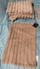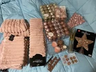 1 pink plush tree skirt 2 pink plush table runners 8 pink plush placemats 110 pink and light tan/gold ornaments, shatter proof 12 pink bow ornaments 2 tree toppers one pink, one gold 7 mini pink and gold poinsettia ornaments