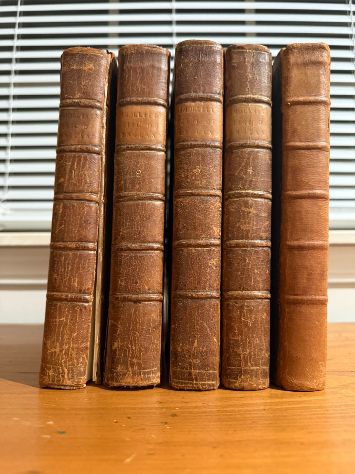 The History of England from the Revolution to the Death of George II by Tobias Smollett, M.D. Five volumes. 1785. A new edition, with the Author's Corrections and Improvements. Early edition of Tobias Smollett’s monumental history of England, first published between 1757 and 1765. Smollett (1721–1771), celebrated novelist and historian, brings his sharp wit and critical perspective to the events from the Glorious Revolution of 1688 through the reign of George II. His narrative remains a major historical source for the 18th century and reflects the Enlightenment ideals of reason, politics, and progress. Octavo volumes in uniform contemporary full leather bindings (rubbed, with some wear to spines and corners), gilt titles to spines. The front cover of Volume I has separated, but will be included in shipment. A handsome and complete set, ideal for collectors of 18th-century history, Smollett enthusiasts, or those seeking an elegant addition to a personal library.