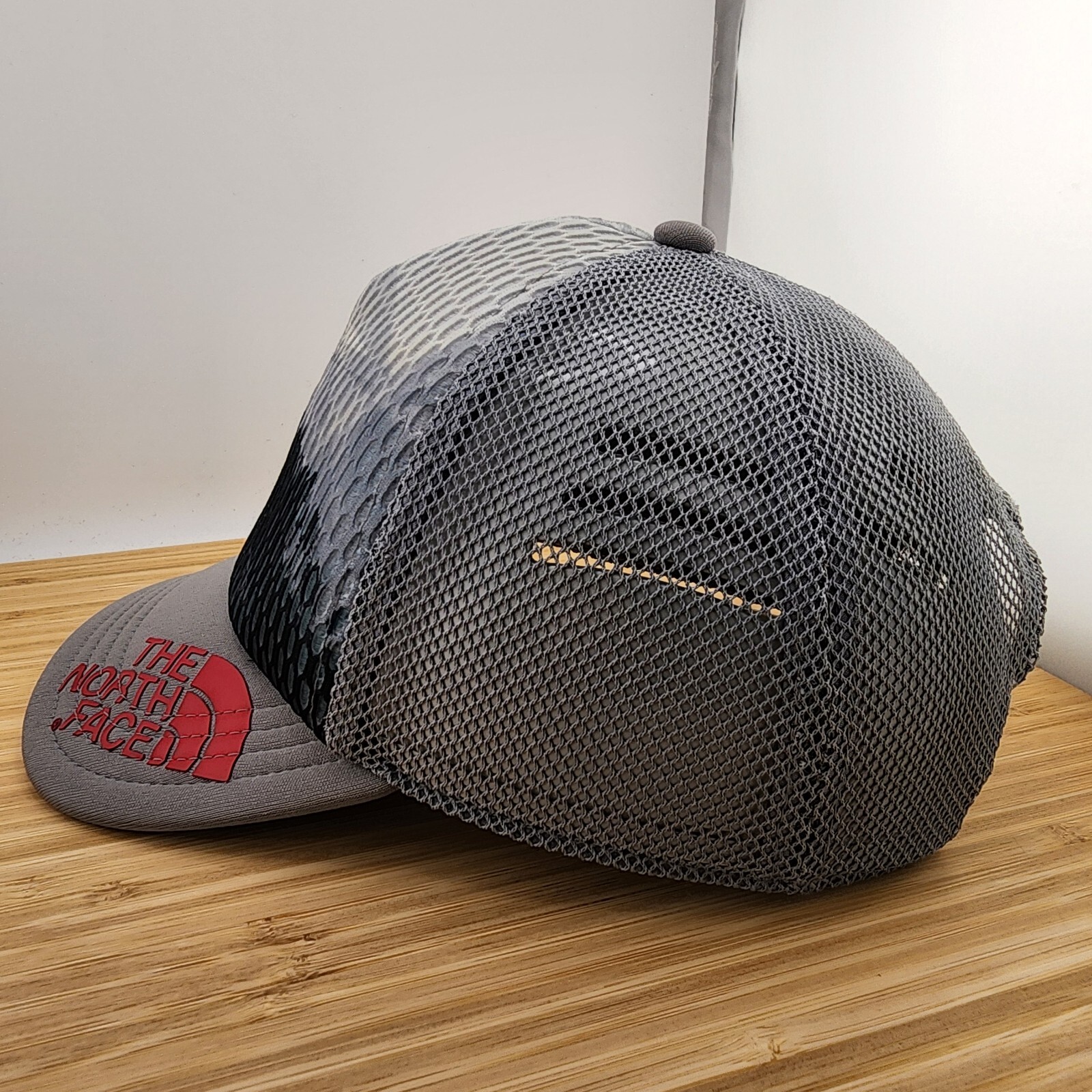 This Snap-Back trucker hat by The North Face is the perfect addition to any wardrobe. With a solid pattern and gray color, it's versatile and stylish. The hat features an adjustable, unstructured design with breathable fabric, making it ideal for travel, casual wear, or work. The hat is adorned with a nature and USA themed design, perfect for outdoor enthusiasts. It's available in one size, suitable for both men and women. The hat is not signed, vintage, or personalized, making it a great choice for those who prefer a simple and timeless look.
