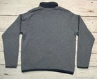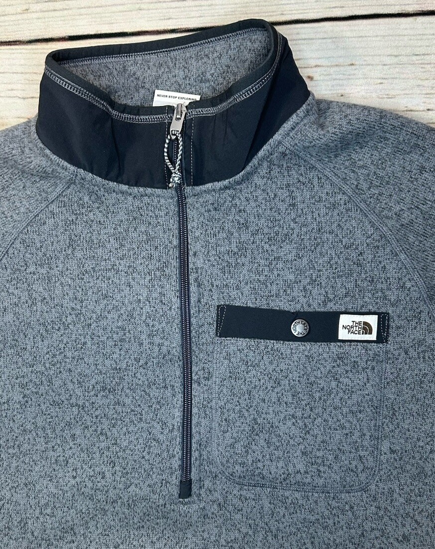This is a men's gray 1/4 zip sweater by The North Face, made of polyester fleece fabric. The sweater features a mock neck and long sleeves, suitable for travel and casual occasions in winter, fall, and spring. It is machine washable and has The North Face logo as accents, offering a regular fit in size M. This pullover sweater does not have a graphic print and is designed for comfort and warmth during outdoor activities. Check pictures for condition and measurements for size.