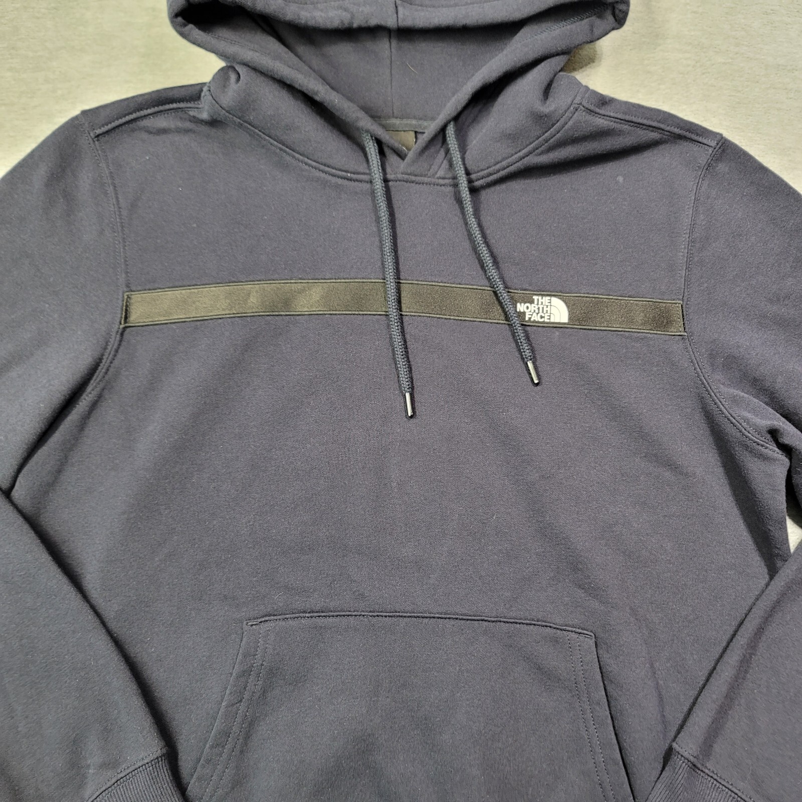 This is a stylish and comfortable men's hoodie from The North Face in size medium. The hoodie features a striped design in navy blue with a drawstring closure and a logo accent. Made from a cozy fleece material that combines polyester and cotton, it has long sleeves and a regular fit. The hoodie includes a hood and pockets, making it a practical choice for activities like gym training, walking, and hiking. Perfect for casual wear or outdoor adventures, this hoodie offers both style and functionality.