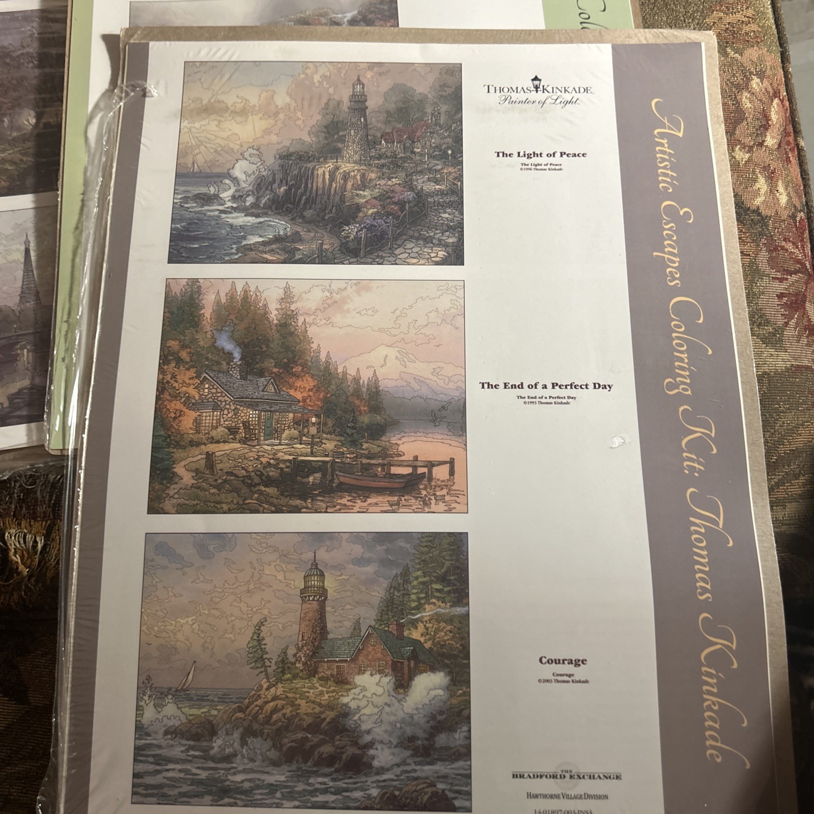 Explore the Art of coloring with this lot of 6 Thomas Kinkade Artistic Escapes Coloring sheets from the Bradford Exchange. Measuring 11x14 new in original packaging (one has a tear in front). Two sets of pencils are included. Scenes are San Francisco Golden Gate Bridge, central park in the fall, Paris, Eiffel Tower, Bridge of Hope, hidden arbor, hometown bridge, the light of peace, the end of a perfect day, courage, beginning of a perfect day, evening in the forest, evening majesty, Nanette’s cottage, stepping stone cottage, cobblestone mill, make a wish cottage, friendship cottage and dogwood chapel