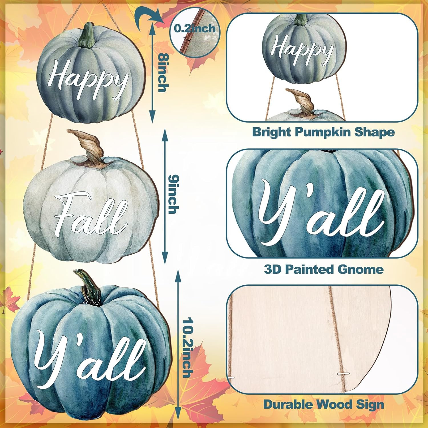 Thyle 3 Pcs Fall Pumpkin Decor Blue Wall Signs Wooden Hanging Door Product Details Mounting Type: Door Mount,Wall Mount Product Dimensions: 8"L x 8"W Shape: Rectangular Item Weight: 0.37 Kilograms Style: Classic Style Pre-printed: Pumpkin/Autumn Themed Item Thickness: 0.2 Inches Item Weight: 13.1 ounces Manufacturer: Thyle Country of Origin: China Item model number: DEA-Thyle-250 Batteries required: No Color: Pumpkin Brand: Thyle Material: Wood, Metal Theme: Halloween Recommended Uses For Product: Property Fall Themed Gift: whether it's housewarming, autumn, Thanksgiving, or Halloween, autumn pumpkin decorations are the ideal choices for gifts to family, friends, and neighbors; If you hang these signs where all your guests can see it, they will add more festive atmosphere to the special Thanksgiving holiday in autumn Exquisite Decor: you can apply this pumpkin decoration as a home decor, which can be applied to decorate your living room, dining room, bedroom, office, kitchen, and other places, creating a rich autumn and harvest atmosphere; At the same time, the particular exterior design of this pumpkin decoration can fully showcase your artistic taste Addition to Your Space: this autumn door hanger can be applied indoors and outdoors; The width of this decoration is about 10.2 inches, 9 inches and 8 inches respectively, and the thickness is about 0.2 inches/ 0.5 cm, suitable for your front door or wall, which will bring some joyful atmosphere to your neighbors, friends, and family, and gain additional happiness Trustworthy Materials: our autumn pumpkin listing applies quality wood materials, which is sturdy, durable, safe, odorless and not easy to deform or fade, supporting a long service time for you, besides, the meticulously polished surface comes with a reliable coating, making it smooth, with clear printing and comfortable touch Create Autumn Atmosphere: our pumpkin tags, with clearly and naturally patterns printed on them, are meticulously crafted and pay attention to details, and if you apply them to welcome autumn, they will add particular features to your home, making your day enjoyable, leaving you an unforgettable autumn memory