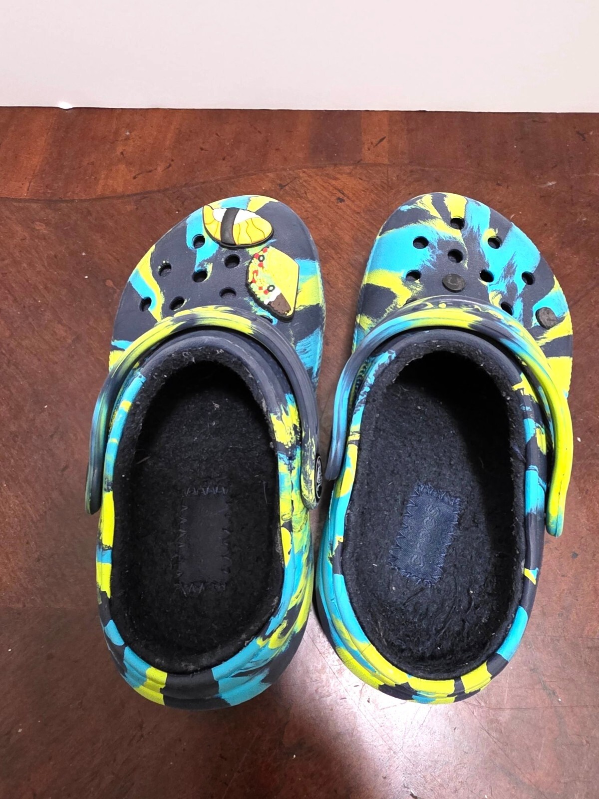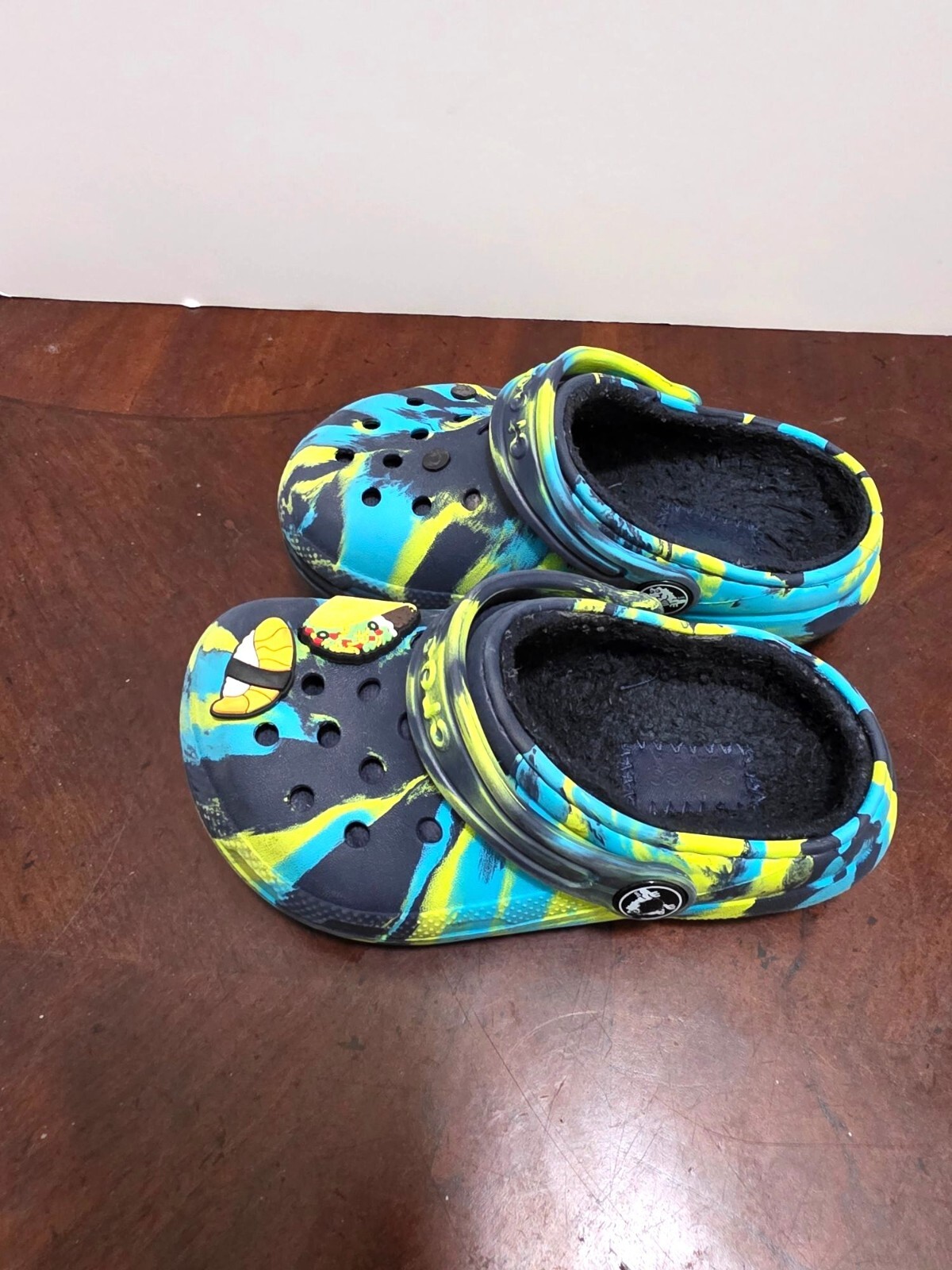 These Crocs clogs feature a vibrant tie-dye design with a cozy fuzzy lining for added warmth. The bee charm adds a playful touch to the footwear. • Adjustable heel strap for secure fit • Slip-resistant sole for safety • Lightweight and durable material • Suitable for casual or outdoor wear CONDITIONS pre owned, Slight signs of wear on soles and interior lining. good conditions. see photos for more details.