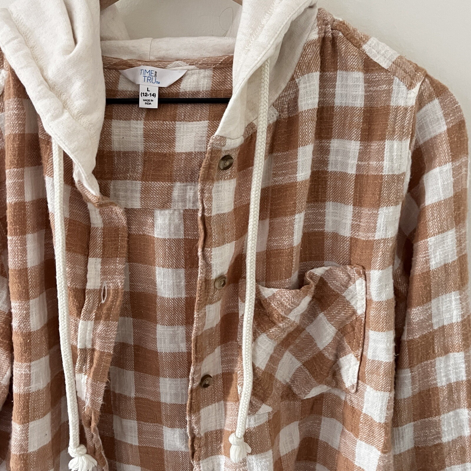Cozy up in this Time and Tru Women's Button Down Hooded Flannel Shirt in a charming brown acorn color. The relaxed fit and long sleeves with button cuffs make it perfect for a casual day at home or out running errands. The attached hood with drawstring adds an extra touch of warmth and functionality to this plaid top. Made of 100% cotton, this flannel shirt is soft to the touch and easy to care for. Its button-down closure and plaid pattern give it a classic look that never goes out of style. Whether you're dressing it up or down, this shirt is sure to become a staple in your wardrobe.