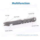 All-in-Design. EDC multi tool, with multi functions of thumbtack puller, box opener and bottle opener. Pry end could be used to open the clear box tape on the package. If you are like most people who are looking for a convenience in EDC tool, you'll be glad with the functional all-in-EDC tool. Clip & Lanyard Hole Design. With the lanyard hole and pocket clip design, could be attached to your clip to your belt loop or pocket, which is convenient to carry. Portable & Compact. Weight only 1.62oz/ 46g. 4.72"/ 120mm in length, 0.63"/ 16mm of width and 0.31"/ 7.76mm in thickness. Anti slip design for convenient using. A good EDC tool for outdoor camping hiking, a great addition to you EDC gear. Made of TC4 titanium alloy material. High strength and corrosion-resistant. A multi EDC tool for everyday carry to use, not suitable for large heavy work.
