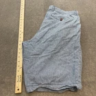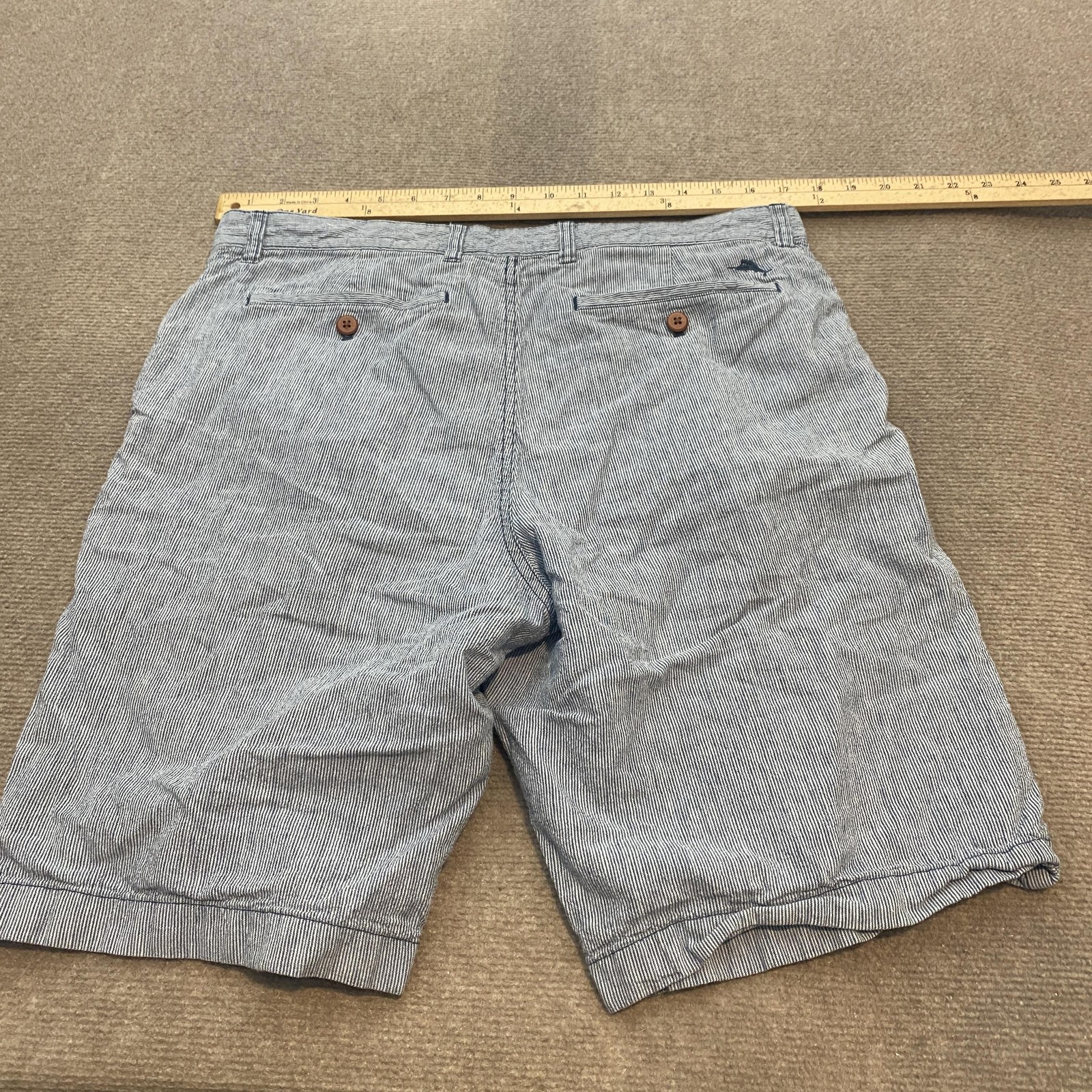 Previously worn with light overall wear and noticeable wrinkling from storage, no stains or holes seen. Fabric and seams appear intact, with zipper, waistband, and buttons all functioning properly. Brand: Tommy Bahama Style: Mens casual flat-front shorts with fine blue and white vertical stripe pattern. Color: Blue and white stripe Size on tag: 34 Materials: 55% linen, 45% cotton; made in Indonesia. Details: Zip fly with button closure, belt loops, front slant hand pockets, rear welt pockets with button closures, embroidered marlin logo above back pocket, lightweight breathable fabric ideal for warm weather or resort wear. Tag codes: RN 86549; CA 38279.
