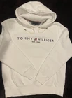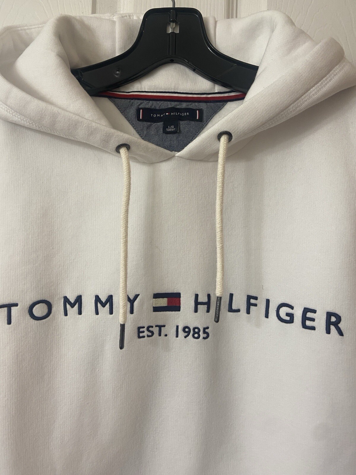 Crafted for both comfort and style, this crisp white Tommy Hilfiger hoodie in size Large offers a versatile addition to any wardrobe. Its unisex design makes it a great fit for anyone looking for a casual, yet fashionable layer. The hoodie features a classic pullover style with a drawstring closure, allowing for an adjustable fit tailored to your preference. The hoodie is made from a soft blend of cotton and polyester, ensuring breathability and durability. Long sleeves and a hood add to its functionality, making it suitable for a variety of activities including running, jogging, football, and gym workouts. Embellished with the iconic Tommy Hilfiger flag, this piece is a testament to both sporty elegance and casual flair.