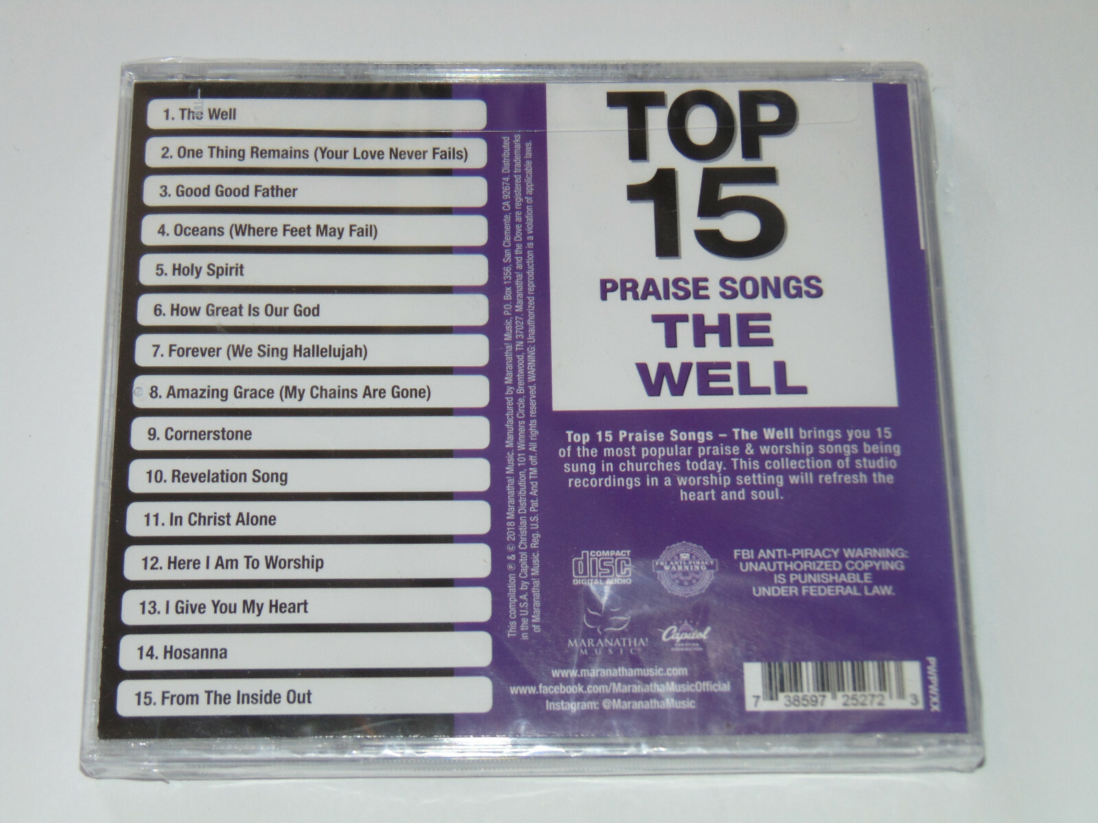 brand:MratCountry/Region of Manufacture:United StatesNumber of Discs:1Genre:ChristianNotes:Maranatha! Music adds a new release to it's popular Top 15 series: Top 15 Praise Songs - The Well boasts 15 of the most popular praise & worship songs being sung in churches today with fresh recordings in keys and arrangements that are easy to sing. The Top 15 franchise is a part of Maranatha!'s 'Top' brand of releases, which has sold more than 2 million units since it's inception, and this brand extension continues the best-selling tradition.Item Weight:0.18 lbItem Height:0.38 inArtist:VariousUPC:0738597252723Release Year:2018Release Title:Top 15 Worship Songs: the WellNumber of Tracks:15Item Length:5.59 ingtin13:0738597252723Format:CDTracks:The Well, One Thing Remains - Your Love Never Fails - Your Love Never Fails, Good Good Father, Oceans - Where Feet May Fail - Where Feet May Fail, Holy Spirit, How Great Is Our God, Forever - We Sing Hallelujah - We Sing Hallelujah, Amazing Grace - My Chains Are Gone - My Chains Are Gone, Cornerstone, Revelation Song, In Christ Alone, Here I Am To Worship, I Give You My Heart, Hosanna, From The Inside OutItem Width:4.97 inRecord Label:Mrat, Maranatha