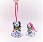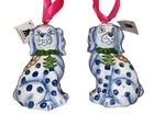 TRADE CIE NEW WITH TAGS Becca Speight artist pair of beautiful blue and white Staffordshire dog ornaments. With pink ribbon hangers these hand painted ornaments will be a keepsake for the sophisticated home for years to come. Ready for the holidays or all year long. 3" x 5" The matching accessories and cats are available while they last.