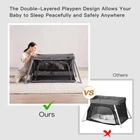 【 Lightweight and Stable 】: This baby portable playpen adopts a stable trapezoidal design, ensuring even bottom support and preventing the crib from tilting, thereby improving stability and allowing babies to play safely. This has increased parents' confidence in the safety of travel playard 【 Visual Design 】: The side of the play crib is made of soft and breathable high-quality mesh fabric, which is detachable and machine washable. The visual design not only allows parents to see the baby, but also provides sufficient ventilation to ensure that the baby feels comfortable while playing in the crib. Side zippered door design allows babies to easily enter and exit 【 Assembly in seconds 】: This playard adopts a folding design. After opening the package, you only need to open the four brackets, fully open the travel crib, lock it, and put it into the mattress to use. It can be easily set and disassembled in a few seconds, which is very convenient. The baby playards weighs around 15lbs, new mothers can independently complete storage and folding, making it easy and effortless 【 2-in-1 Portable Travel Playpen 】: 1.baby playards for sleeping: equipped with a bunk bed that can be disassembled and assembled through zippers, and equipped with a soft mattress, providing a safe and comfortable sleeping environment for babies. 2.baby playards for playing: Remove the bunk bed with a zipper and switch to game bed mode after a few seconds. providing a happy playing environment for babies 【Travel crib】: This portable travel crib is spacious enough and suitable for babies aged 0-3 years old. The soft mattress provides a comfortable resting and entertainment place for babies to play or rest on the game fence. The mattress is also easy to clean, and a gentle wipe with a wet wipes can clean up any dirty,In addition, it comes with a handbag with an armrest, which can be used for both shoulder and back, making it easy to carry and suitable for various outdoor scenes