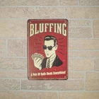 Show everyone you have the testicular fortitude needed in a poker game with this novelty wall sign. Made from metal and made to look retro, this funny wall decor reads: "BLUFFING A Pair Of Balls Beats Everything!" on a deep red background with distressed edges and the graphic of a man in a tie and sunglasses holding a poker hand, reminiscent of 1950s advertisements. Great humorous decor for your man cave, rec room, or poker night, this novelty sign is shows it takes a pair of balls to bluff. Mount this metal sign on your bar or pub wall and get laughs from customers and guests. Give this novelty metal sign as a gift to friends or family members and get one for yourself. Novelty poker game sign makes you interesting wall art measures approximately 12" long, 8" wide, and includes 4 pre-drilled holes for easy wall or door mounting. As with all our items, this funny metal sign ships brand new with our 100% customer satisfaction guarantee. Show everyone you have balls with this novelty wall sign Funny wall decor reads: "BLUFFING A Pair Of Balls Beats Everything!" on a red background Metal bluffing sign is great wall decor for your garage, man cave, bar, or next poker game Give this metal sign as a gift to friends or family members and get one for yourself Novelty wall art measures approximately 12" long, 8" wide, and includes 4 pre-drilled holes