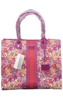 This Trina Turk Tote is a stylish and versatile bag suitable for travel and workwear. The bag has a rectangular shape with a snap closure and double handles. It is made of faux leather in a colorful floral pattern and features gold-plated hardware. The bag has a large size of 16.5 inches in width, 14 inches in height, and 7 inches in depth. The bag comes with a detachable strap and a bag charm. It also has several features such as an adjustable strap, inner pockets, and a lined interior. The bag is suitable for those who love colorful and stylish accessories. This Trina Marjorelle model is a part of the Trina Turk Tote product line, made in China with high-quality fabric lining.