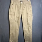 These True Religion cargo pants for men in size 32 are designed in a classic baggy style with flap pockets. The pants are tan in color and feature a canvas fabric type with a polyester blend material. They have a pleated front, button and zipper accents, and a logo detail. Ideal for travel, casual wear, or workwear, these pants offer comfort, easy care, and ample pockets for a versatile and stylish look.