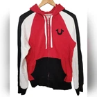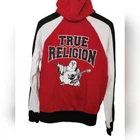 Zip up True Religion Logo Hoodie jacket. Size small. Worn and washed 3 times. No holes, stains or pilling. Laying flat measurements in inches: pit to pit 21, shoulder to hem 25.