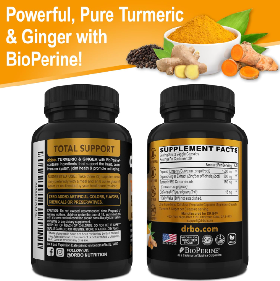 TUMERIC CURCUMIN Max Potency With Bioperine Black Pepper 1950MG - 60 CAPSULES US Warehouse - FREE & FAST Shipping in US Product Description: These statements have not been evaluated by the FDA. This product is not intended to diagnose, treat, cure, or prevent any disease or health condition. Extra Strength Turmeric and Ginger Supplement: Premium T3 organic turmeric supplement ginger complex 1950mg with 95% standardized curcuminoids & 15mg BioPerine black pepper extract & max absorption BioPerine & Ginger for Max Absorption: BioPerine, a patented black pepper extract, helps up to 2000x better absorption than just pure turmeric capsules Knee Support: Turmeric Curcumin with black pepper is an organic supplements super antioxidant extract; turmeric powder with curcuma longa; men & women turmeric and ginger supplement Organic Turmeric Capsules: 1950mg Organic Turmeric Curcumin with BioPerine supplement ginger capsules; tumeric and ginger supplements with BioPerine black pepper extract ginger turmeric supplement High Potency: Vegan Organic Tumeric and Curcumin supplements use the best quality tumeric and ginger; high grade turmeric pills, the most potent turmeric curcumin with black pepper bioperine Feedback: 1.Any question for your order, please contact us in time, we will reply to you within 24 hours and give you a satisfactory answer. 2.If you are satisfied with our products and services, hope to take up your a little precious time to leave feedback reviews for our products.Thanks! 3.Your satisfaction is our effort. Welcome to order again! Have a great day! Our Policy: 100% Satisfaction Guarantee 20% of restocking fee will be charged for return item