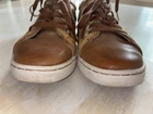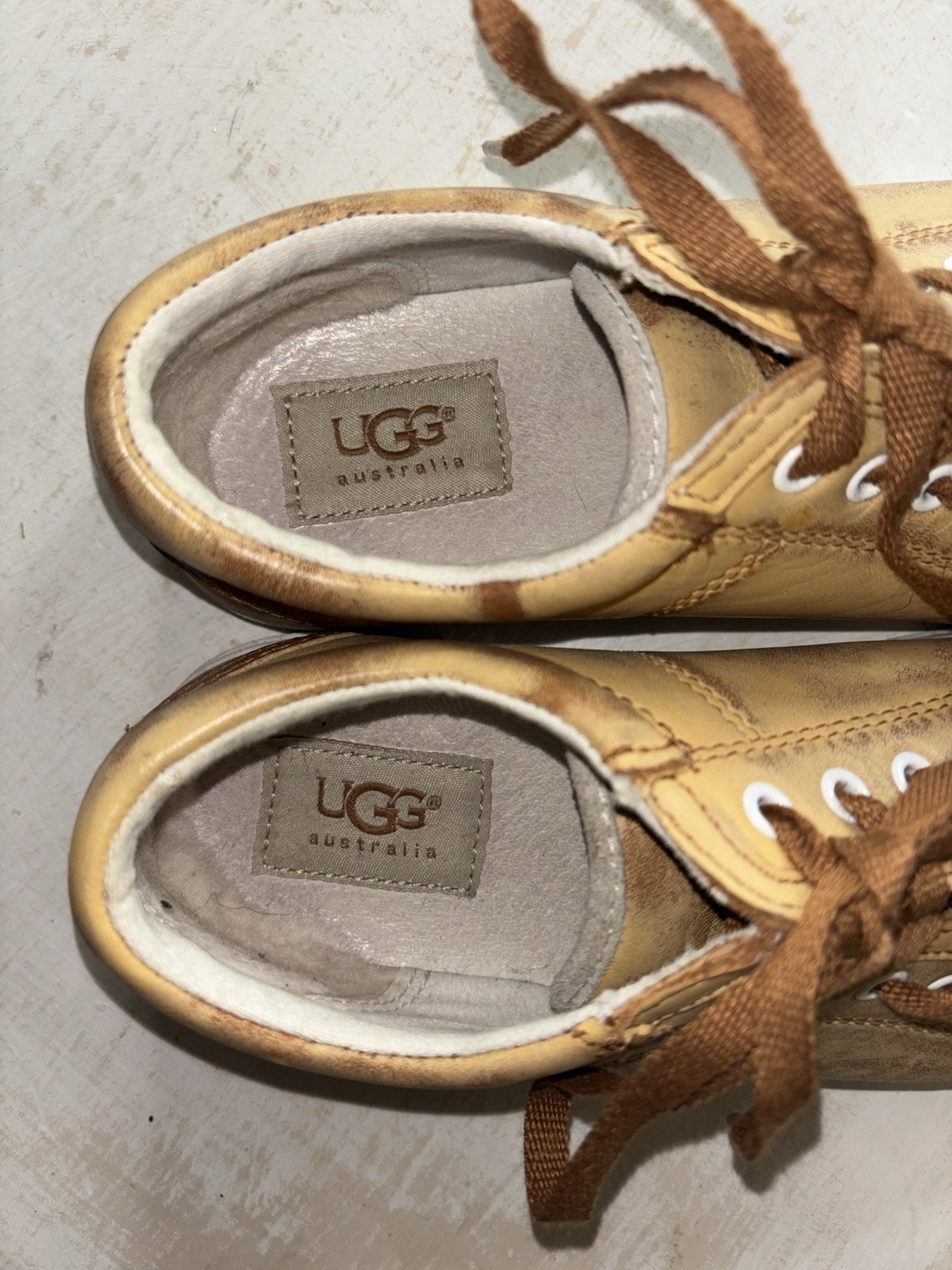 The UGG Distressed Tan Casual Sneakers in size 6 are stylish and comfortable shoes designed for casual occasions. Made with leather material in a tan brown color, these sneakers feature a trendy sneaker style with the signature UGG brand. Perfect for women looking for a fashionable footwear option that adds a touch of Australia-inspired flair to their outfit. Nice condition with some bottom sole wear