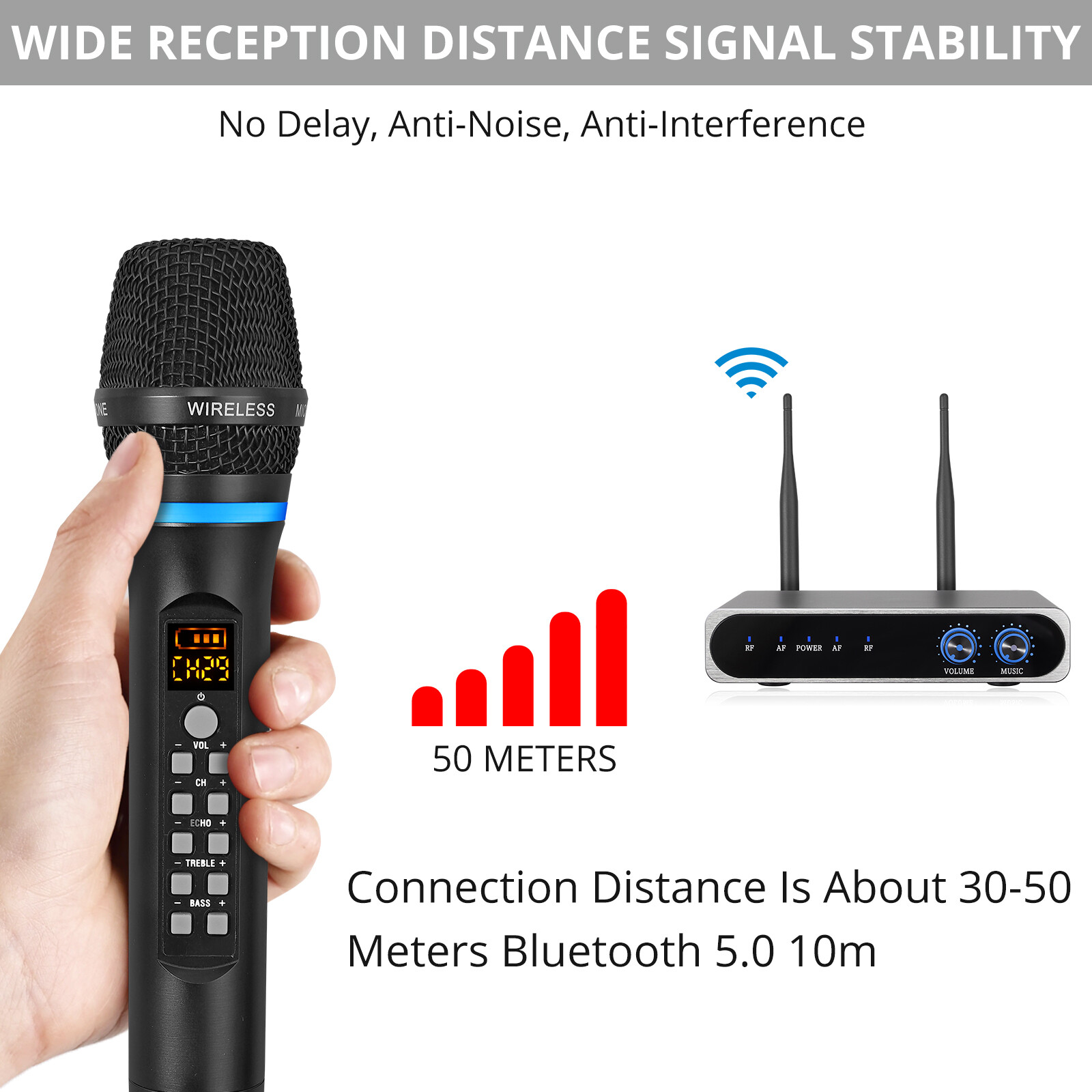 Description: UHF microphone system, Ultra high frequency signal transmission, offers powerful and stable wireless connection, allows to deliver your voice without delay or interference, crisp vocal & excellent sound reproduction Unlike other low Grade VHF unit. Ideal for karaoke machines, DJ, singing, Church, weddings, Speaker, amplifiers, PA systems. Our advantages: 1. Rechargeable microphone (different from regular microphones) 2. With Bluetooth (used to connect to mobile phones and TV to play music) 3. Microphone with high and low reverberation and volume adjustment (multifunctional microphone) 4. The host comes with music volume control and microphone volume control (multi-functional host) 5. Microphone input interface (can connect multiple sets of microphones) 6. 3.5mm AUX input output + 6.35mm output (AUX input can be connected to TV for music input, AUX output can provide stereo sound) 7. One in two charging cable (charging two microphones simultaneously) Specification: Receiver desktop Frequency: U band Frequency stability: <0.002% Sensitivity: 2/MV Adjacent channel interference ratio: >90DB Mirror interference ratio: >88DB SNR: >95DB Audio output: 0-300MV Working range: standard conditions 20 to 50 meters Accepted channel: 2 channels Power supply voltage: AC/100-240V Bluetooth: 5.0 Antenna: External antenna Launch handheld Carrier frequency: U band Frequency stability: <0.002% Transmit power: 10MV Current consumption: <25MA Subharmonic: