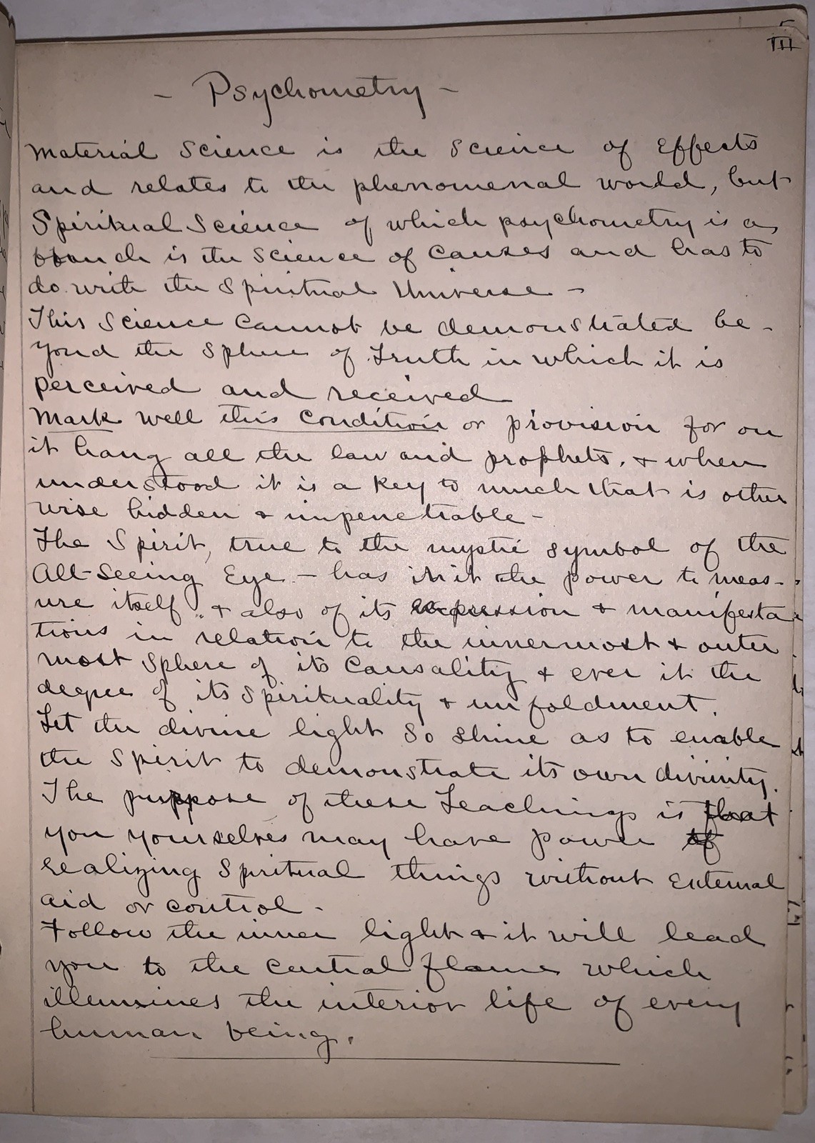 [Grumbine, Jesse Charles Fremont] An original unpublished manuscript book consisting of correspondence lessons by J. C. F. Grumbine. "Psychometry" Written Between April 4th, 1901 & July 25th, 1901 Original unpublished manuscript This was part of home correspondence work for a spiritual group called "The Order of the White Rose." The book is bound by two metal fasteners. The contents are grouped into two parts and contain the following "Lessons": Part I I. Psychometry- What is it? Its Sphere in Life. II. The Soul and its Powers III. Vibrations and Sensations IV. Intuition: Spiritual Perception Clairvoyance V. The Soul and its Relation to the Mind and Matter VI. Spirit Auras & Emanations VII. Psychometry: Its Interior & Exterior Aspects VIII. Matter & Mind Manifest the Soul & Its Character IX. Specialists in Psychometrical Science. Psychometry as Revealed in Incarnate and Incarnate Spriit Intelligences Part II X. Consciousness or the Recognition of Soul Concentration and Culturalization XI. Conditions & States, Planes & Spheres, Methods and Attitudes, Cheerfulness XII. Impressions, Names, Dates, Places, Symbols, Visions, & Prophecies Octavo, 140 pages, entirely written by hand in legible English. Chips to a few corners, damage to the first and last few pages, slight musty smell, else in very good condition. If you have any questions, feel free to ask, and don't forget to check out my other listings.