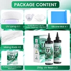 UV Resin with Light,Upgraded 250g Crystal Clear,Low Odor,Fast Cure& Hard Type UV Resin Kit,Silicone Mat,UV Light, for Crafts, Jewelry Making, Casting Fast Curing & Easy to Use:The UV resin cures quickly under UV light or sunlight, with no mixing required. It hardens in just minutes, making it ideal for both beginners and experienced crafters. Crystal Clear & Anti-yellowing:UV resin is infused with antioxidants, enhancing its transparency and yellow-resistance. With a refractive index more than 1.5 times higher than other UV resins, it ensures a crystal-clear finish. It applies smoothly without leaving traces, making it perfect for light-transmitting materials. Versatile for Various Projects:The UV resin is perfect for making jewelry, keychains, home décor, and resin art. It can be mixed with mica powders, glitters, and colorants for vibrant and personalized finishes UV Resin Starter Kit with Light:Everything you need to get started with UV resin is included in this kit. It comes with a UV lamp, 2 mixing rods, a silicone mat, a color mixing cup, and a professional instruction manual. Packaged in a beautiful gift box, it's the perfect gift for anyone who loves jewelry making. Brand Promise:offers high-quality products for creative individuals, ensuring consistency and reliability in every batch. We provide a 12-month free return or exchange policy. If you're not satisfied, , and our support team will assist you within 24 hours.