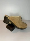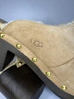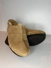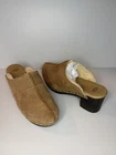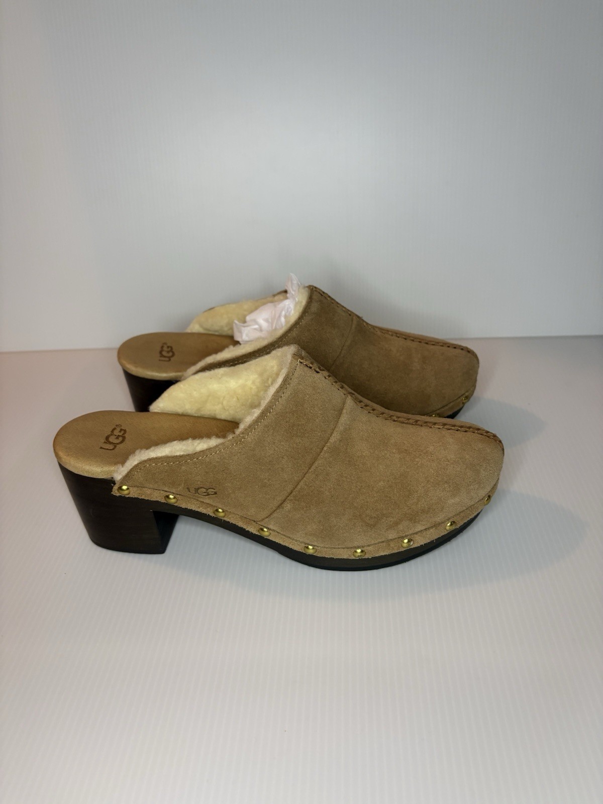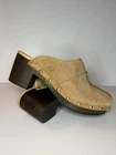 UGG Kassi clogs (also known as the UGG Kassi Genuine Shearling Platform Clogs or UGG Kassi High Heel Clog). The style features a suede upper, a block heel, a wood or wooden-style midsole with stud detailing, and a cozy sheepskin shearling lining. Key Features Material: Crafted from soft suede with genuine sheepskin or lamb leather lining for warmth and comfort. Design: These are slip-on clogs with a backless design, a round toe, and a platform sole. Details: The clogs have classic nailhead (stud) detailing along the midsole and a block heel, typically around 2.75 inches high. Comfort: They include a cushioned PORON® and foam footbed with arch support for all-day wear. Size 7 Excellent condition