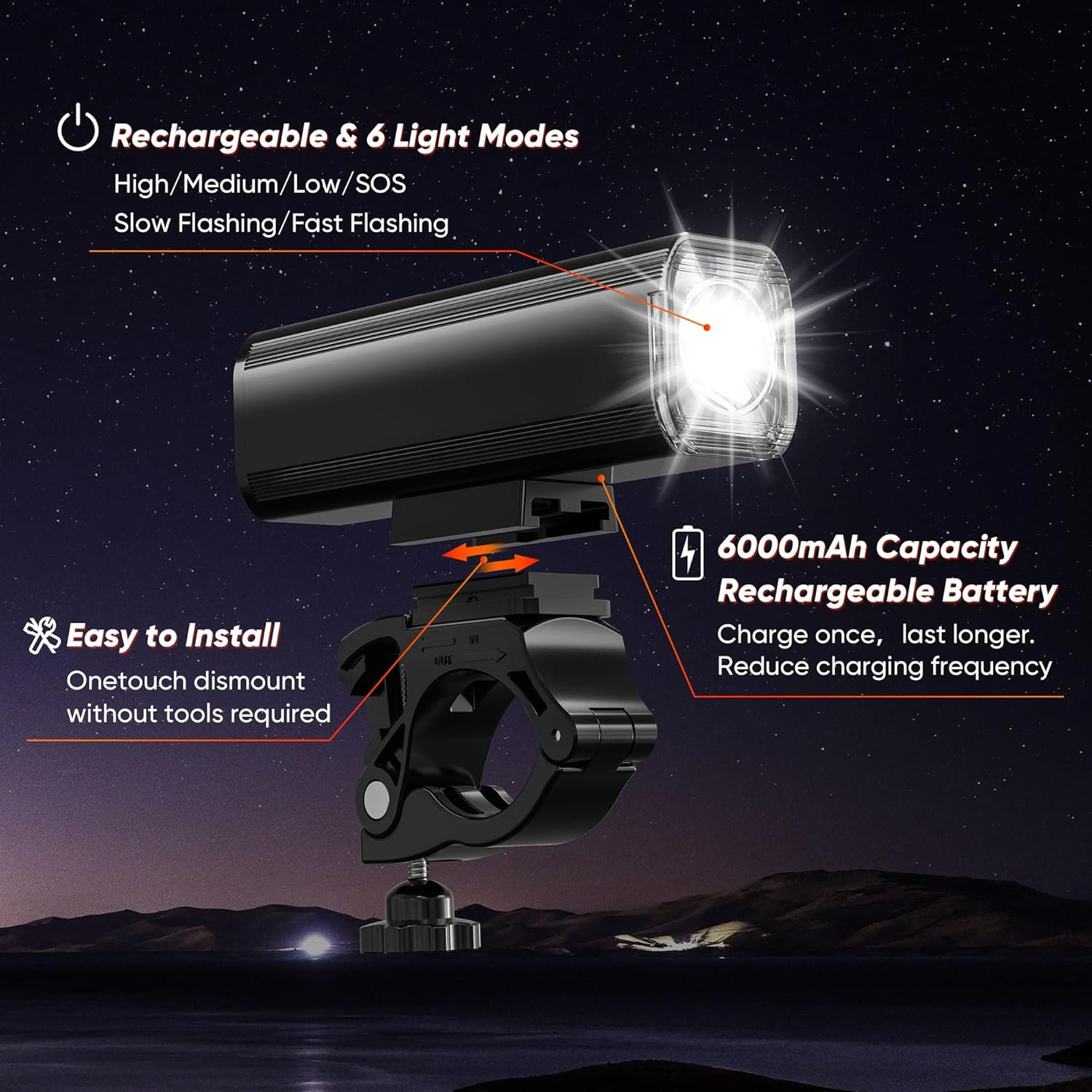 Super Bright Lighting: Equipped with high-power LED beads,providing up to 1200 lumens of brightness, ensuring clear visibility of the road ahead during nighttime cycling and improving safety. The running time of the headlights is 5-15 hours, and the running time of the taillights is 50-80 hours, which can meet your lighting needs for long-term cycling. High-Capacity Rechargeable Battery: Built in 8000mAh lithium battery, it supports USB fast charging and can be used continuously for several hours after being fully charged. It can also be used as a power bank to charge your smartphone,Ideal for riding outdoors. Easy to install and carry: The 360 ° adjustable bracket is suitable for most bicycle handlebars and can be quickly installed without tools. the lightweight and portable design also makes it easy to disassemble and carry,very suitable for mountain bikes and commuter bikes. Multiple Mode Options: The headlight and taillight with multiple lighting modes (high beam, medium beam, low beam, flash, slow flash, SOS) to meet different riding needs. easy to switch modes with simple button operations. in special circumstances, it can also be used as an emergency flashlight. Durable,Waterproof& Reliable Service: Made of high-quality aluminum alloy casing, it is very sturdy. IP65 waterproof design ensures normal operation even in rainy or harsh weather conditions.if you encounter any problems, our dedicated customer support team is always ready to assist you through Amazon's easy returns and quick solutions. Product Description