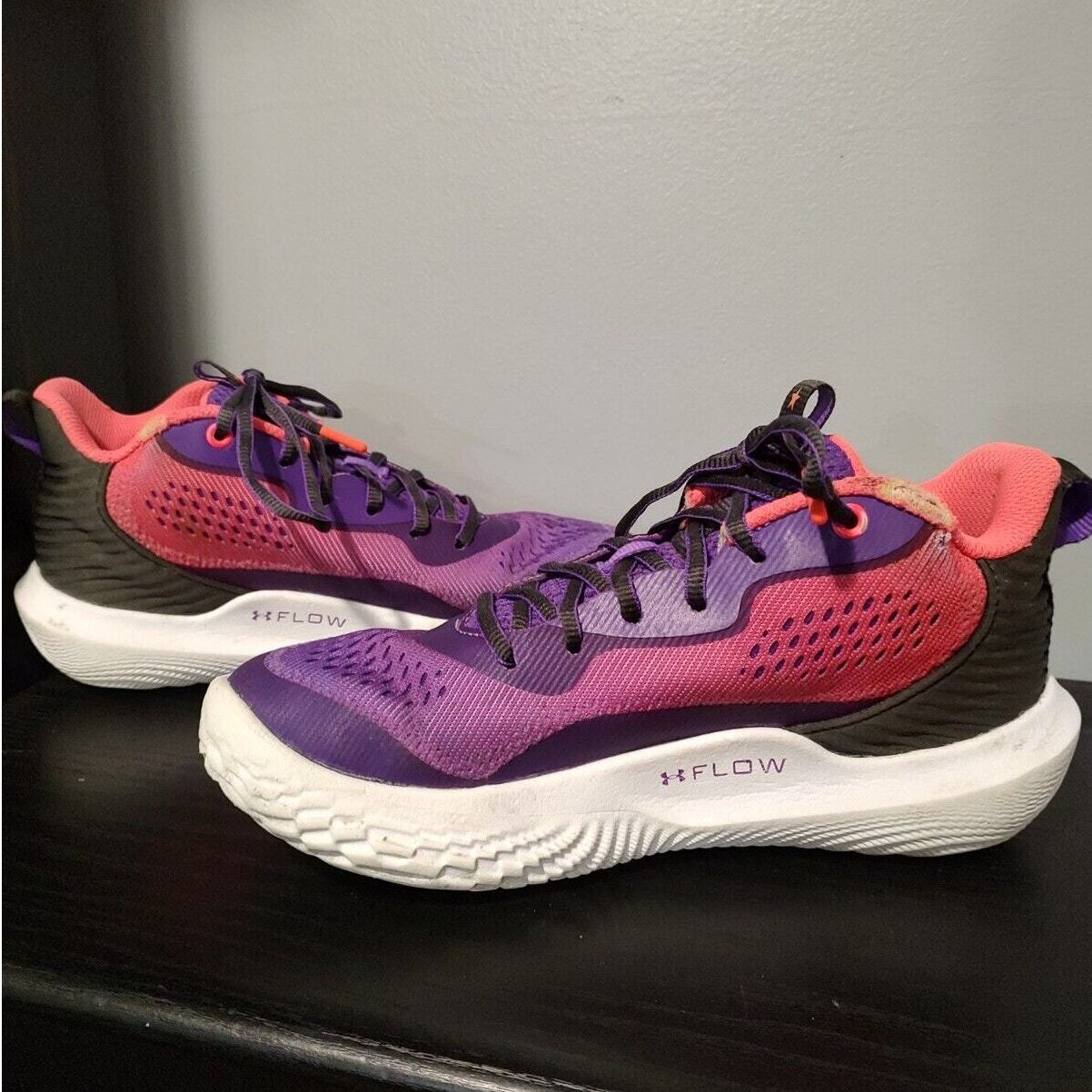 Under Armour Flow Breakthru 2 "International Womens Day" - Purple/pink under armour streetwear basketball shoes, women's size 10. They're the "international women's day" edition/colorway. They're a little stained and have wearing on the lips of the shoes (see pictures) great condition otherwise. Tread is worn They've been thoroughly cleaned before listing Please reference photos before purchasing