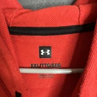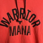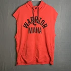 This is a red Under Armour Warrior Mana Project Rock sleeveless pullover hoodie for men in size 2XL. It features a graphic print design, crew neck, drawstring closure, and is made of a cotton blend fleece material. The hoodie has a logo accent, is breathable, and suitable for all seasons. It is part of the Under Armour Project Rock product line, ideal for activities like gym training, bodybuilding, and running. Made in Malaysia.