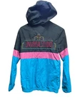 This Universal Studios Hollywood windbreaker jacket is perfect for any casual occasion. Made from softshell polyester fabric, it features a full zip closure and a reversible design. The jacket is hooded and comes in a black color with a University theme. The XS size jacket is lined with polyester and has a soft feel. It is ideal for outdoor activities, including golf, and is made in China. The jacket is perfect for men who are looking for a stylish and functional piece of clothing. 17" chest 18" pit to wrist 25" length