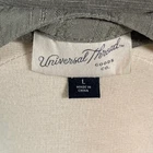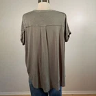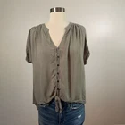 Brand + Style: Universal Thread from Target Features: Olive green/light sage green short sleeve top, button front with tie at the hem, textured Fabric: Front: 100% Rayon/Back: 95% Rayon/5% Spandex Size Large Excellent pre-owned condition Approximate Flat Measurements: Bust - 26" Length - 21", 29" in the back • Smoke free, pet friendly home • Ships next day or sooner • Price negotiable, send me an offer! K16